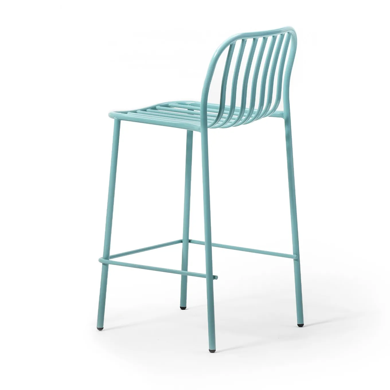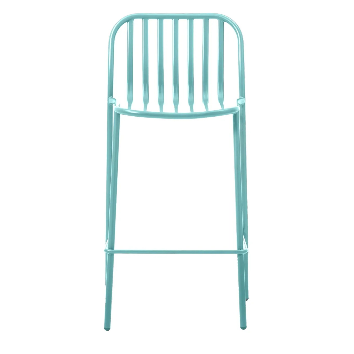 Offered in a bright turquoise finish (Ral 6034) recalling dreamy tropical waters, the solid cylindrical metal frame of this bar stool guarantees lightness and freshness. Multiple bars make up the backrest, whose rounded contours soften an otherwise too rigorous general silhouette. Please refer to the Concierge for inquiries on customization options, outdoor/indoor versions, and optional seat cushion.