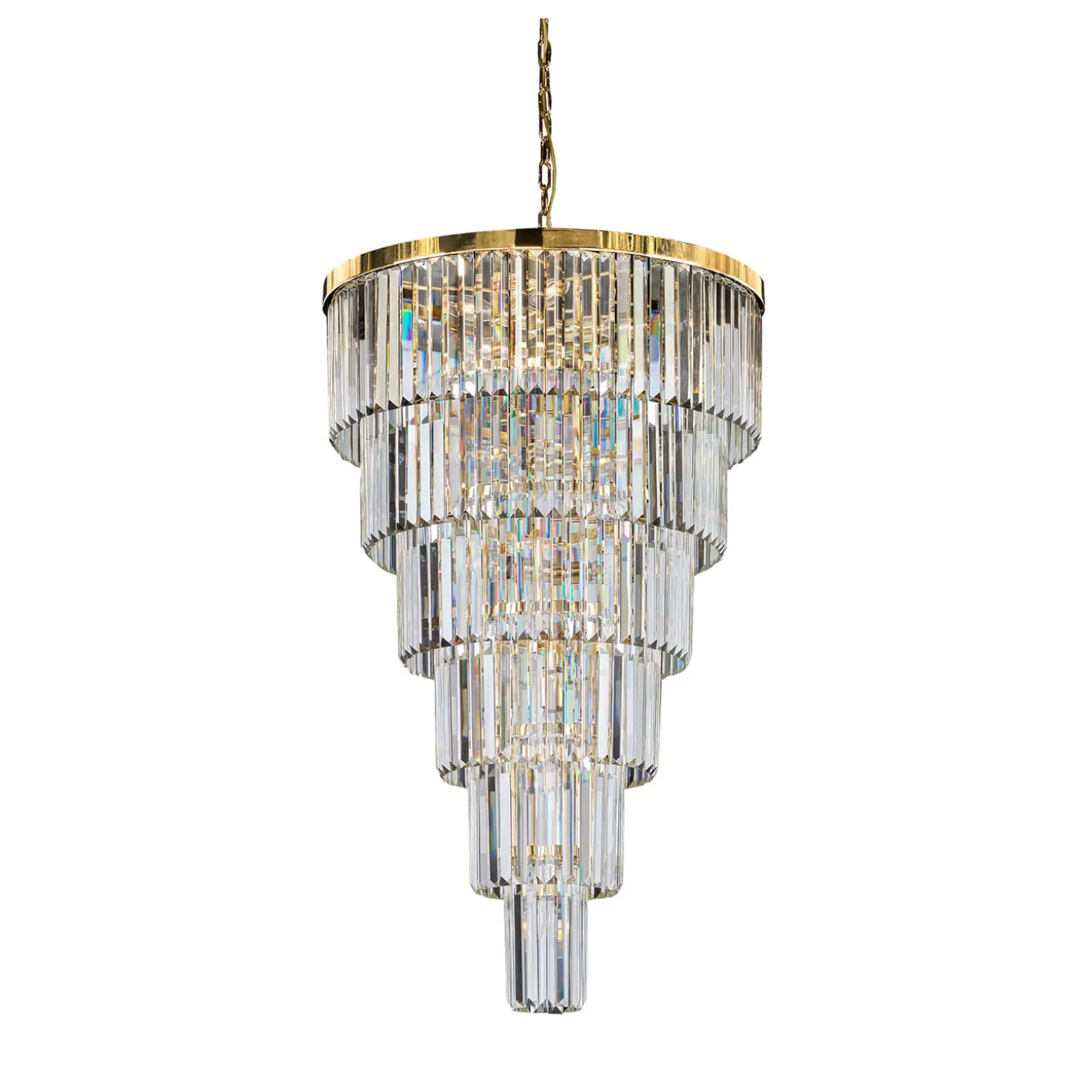 This dazzling suspension lamp is entirely handcrafted in refined polished gold metal and showcases five astonishing tiers of exquisite Murano crystal slats. Whether in a classic or modern interior, this stunning piece will create an impactful lighting effect along with an elegant Art Deco imprint. Also available in polished chrome and glossy black nickel, along with a variety of sizes, please contact the Concierge for details.