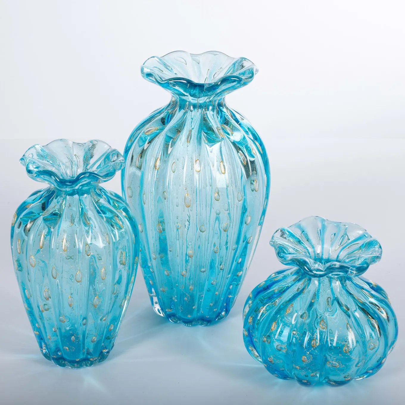 Master glassblowers handcrafted this stylish set of three vases following the ancient balloton technique, responsible for their seductive flounced texture. Offered in different sizes (Ø 11cm – H 10cm; Ø 10cm – H 15cm; Ø 14cm – H 18cm), they flaunt shimmering specks of 24K gold trapped within the glass together with air bubbles. Produced in June 2021, the set makes for a clever solution to display flowers or contain home fragrances.