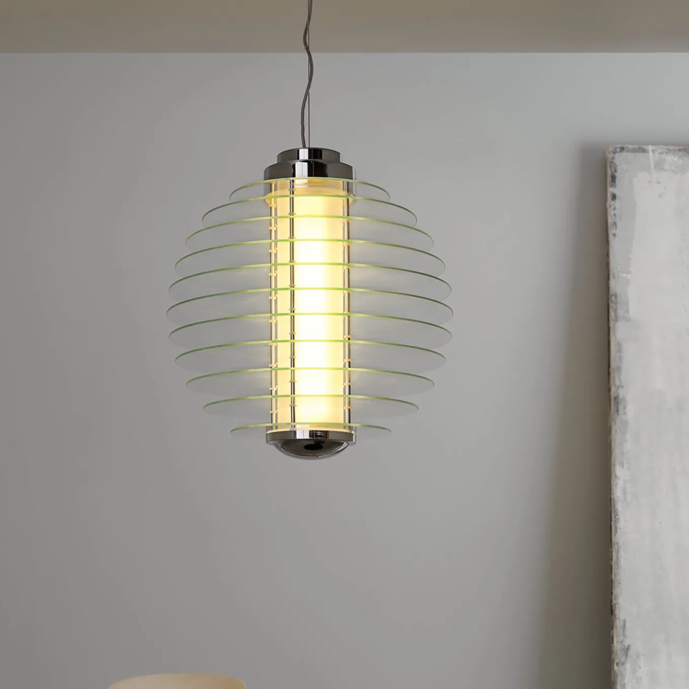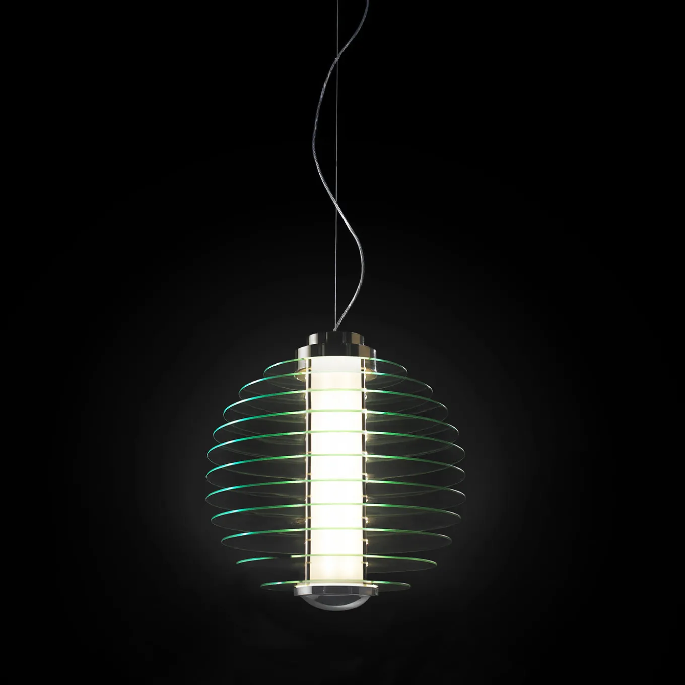 Layers of transparent tempered glass disks create the spherical silhouette of this stunning pendant lamp by iconic designer Gio Ponti. This imposing piece, with chrome-finished brass inserts, wraps a central cylindrical shade in sandblasted glass of 30 cm in diameter, housing four 54 W fluorescent G5 light bulbs with DALI electronic power source. It is possible to choose the height of the four wires hanging from the rose ceiling by contacting the Concierge. The total weight of the piece is 300 kg. The version with methacrylate disks, the weight is 200 kg. This item is only wired for 220V and it is sold with an adapter.