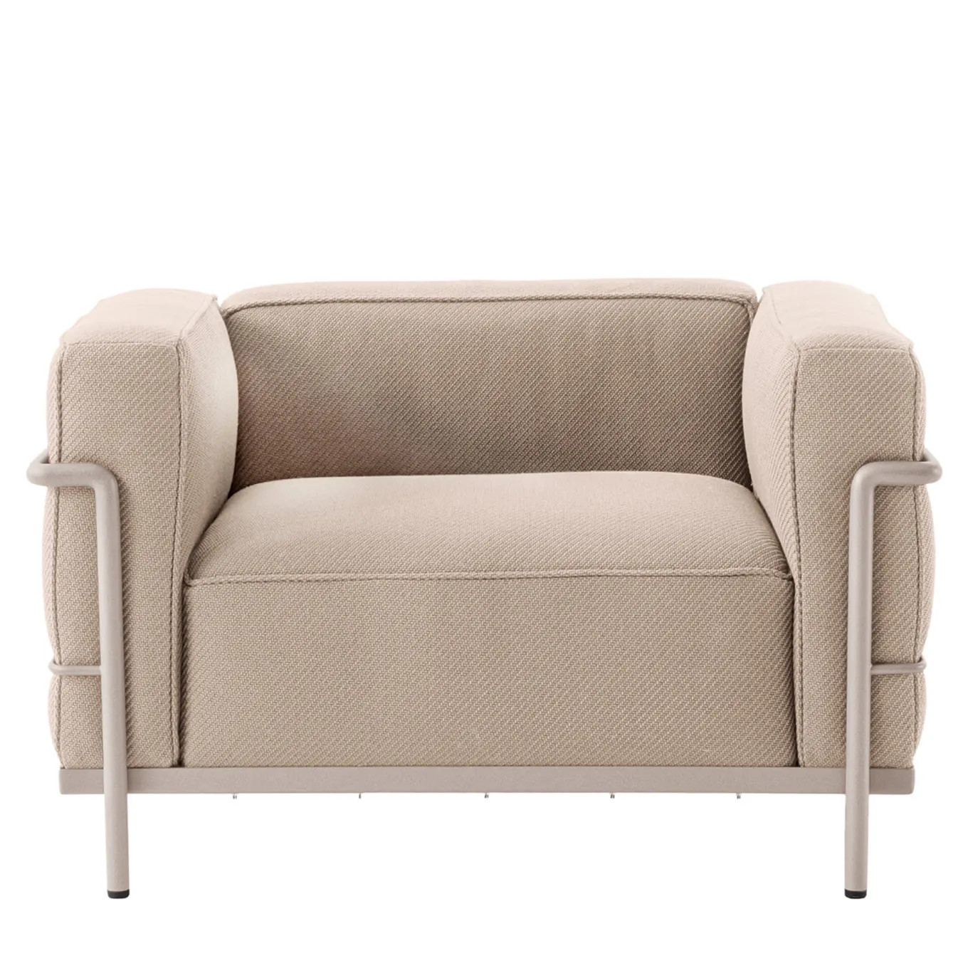 The 3 Fauteuil Grand Confort, Grand Modèle armchair embodies Modernist principles, separating the steel frame from the upholstery, like a building’s load-bearing structure. Four beige cushions rest within a painted steel cage. Cassina, in collaboration with Charlotte Perriand’s heirs and the Fondation Le Corbusier, reinterpreted this icon, introducing this Outdoor version, ensuring timeless elegance in any setting.