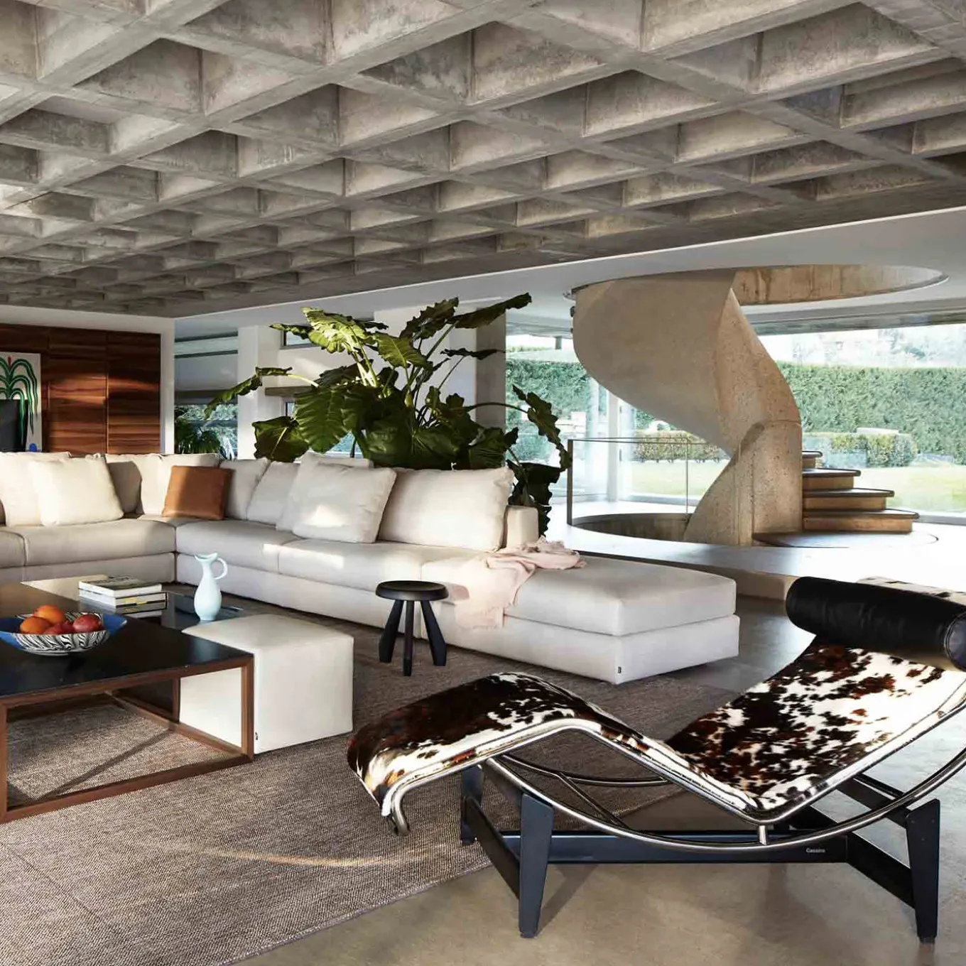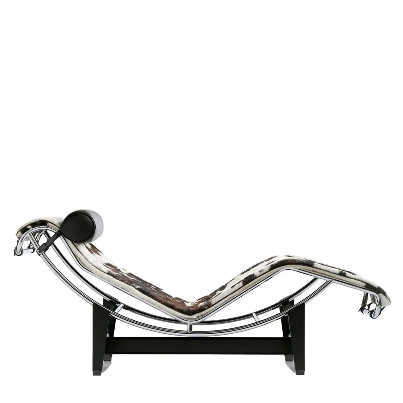 Chaise longue in hairyskin. One of Cassina’s worldwide best-sellers, the 4, Chaise Longue à reglage continu is the quintessential chaise longue, designed in 1928, and based on an in-depth exploration of reclining chairs. The three designers devised the 4, Chaise Longue à reglage continu as an expression of the concept of relaxation, with a focus on the human figure, the link between form and function being reflected in the balance between geometric purity and ergonomic intent. The stability of the lounger, whatever the angle of inclination, is provided by the rubber tubes covering the cross-bars of the underlying frame. As with the other models, the 4, Chaise Longue à reglage continu is based on measurements derived from the Modulor. Today this model is proposed again in the “full black” version, with black base, frame and upholstery.