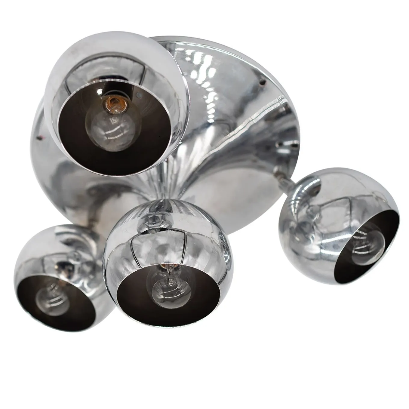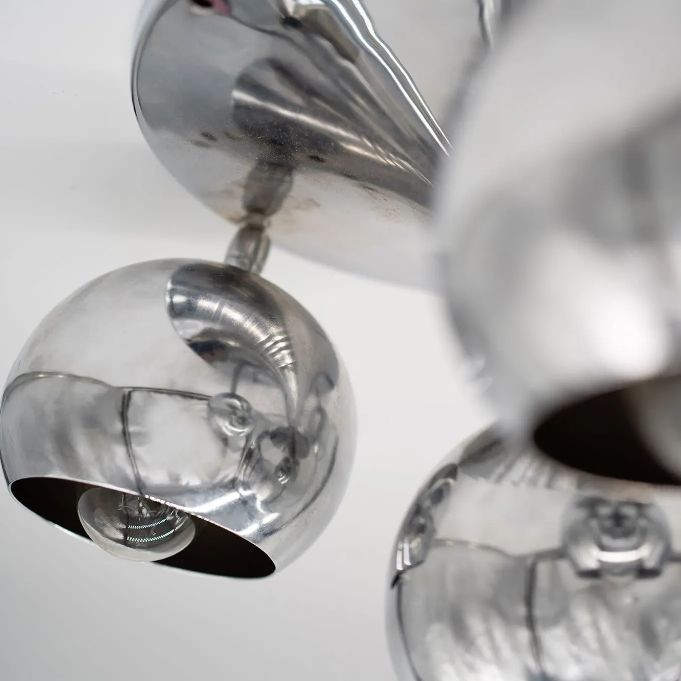 Semi-spherical shades hosting as many E14 bulbs define the intriguing design marking this vintage ceiling lamp, an original Reggiani design. Protruding from the same chromed frame they are part of, the diffusers can be oriented to achieve the desired light distribution according to the mood or need. Also suitable as a wall lamp, it is extremely easy to assemble.