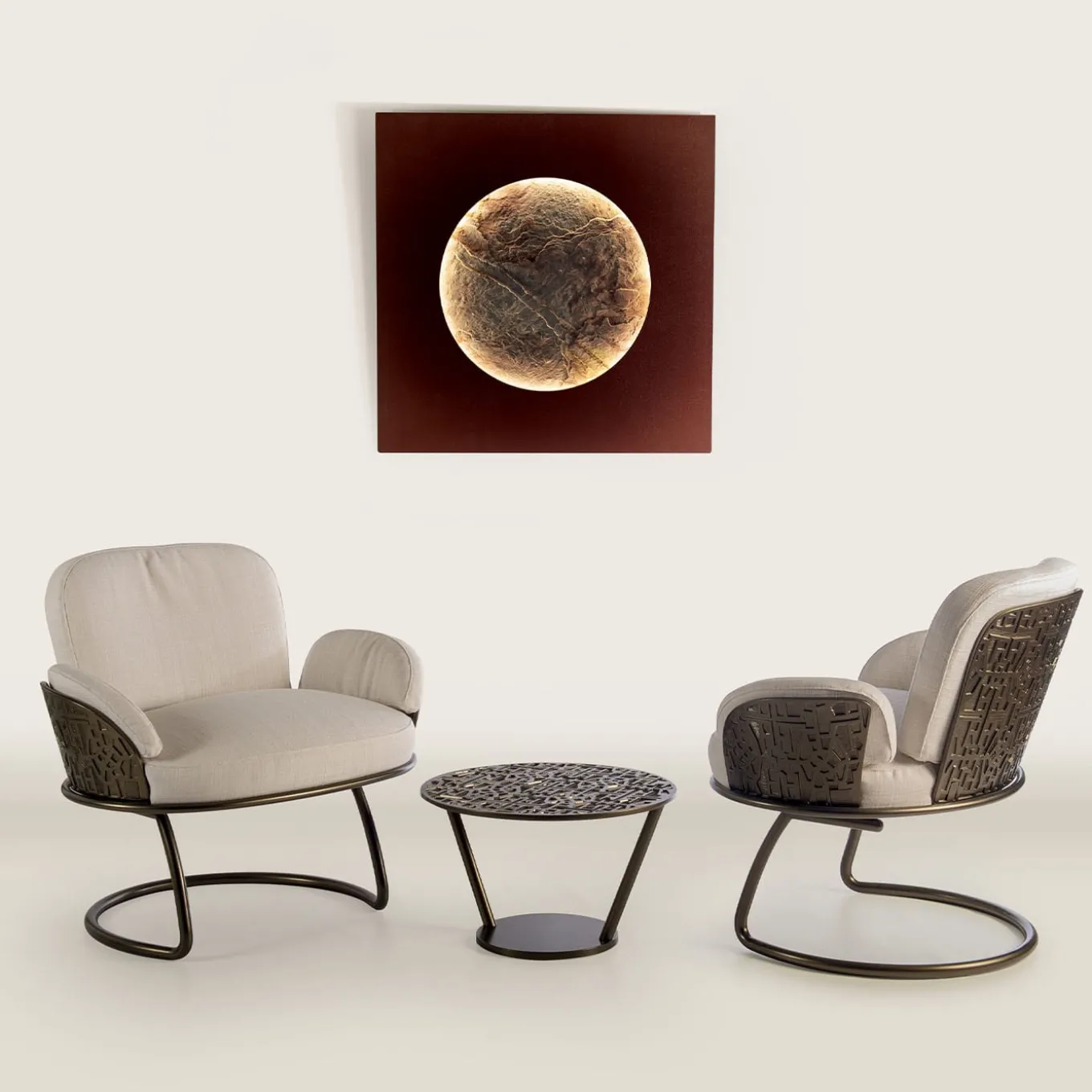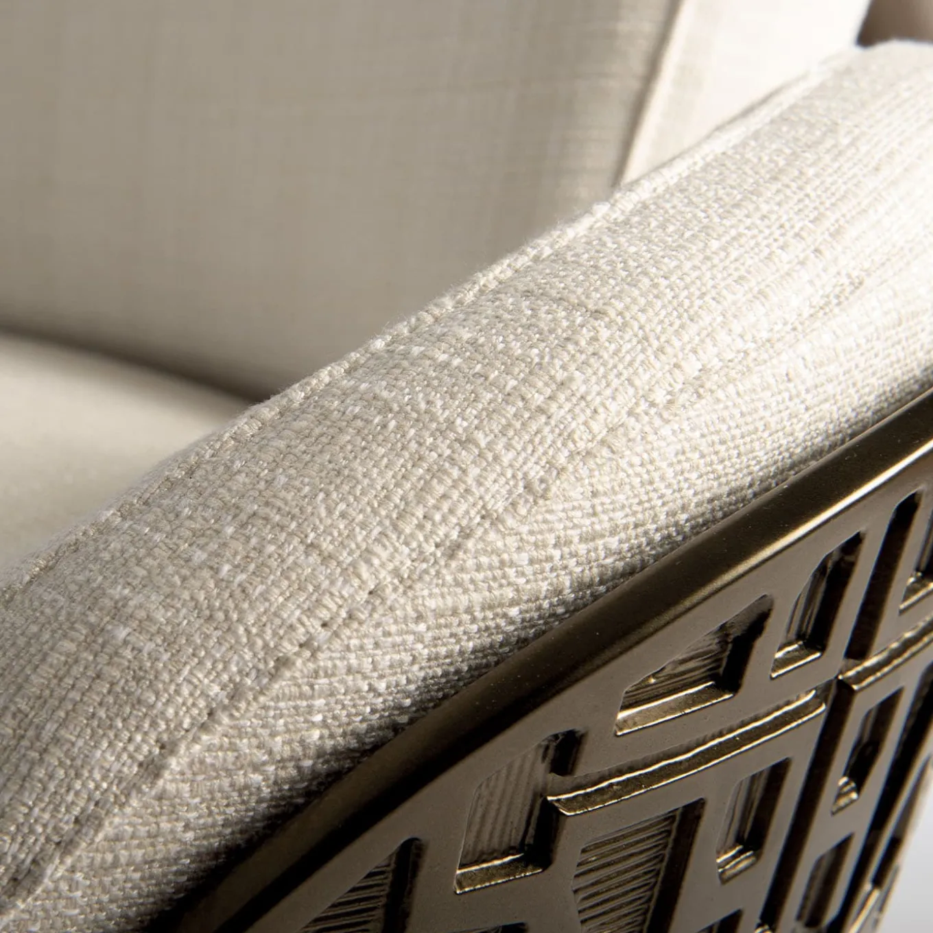 Timeless elegance and sleek silhouette define this gorgeous armchair, an iconic and stylish design from the ’70s Collection. Fashioned of bronze powder paint-finished steel enriched with a detailed backrest obtained with melted aluminum, the sleek and singular silhouette is completed with white-beige fabric upholstery on the seat, back, and armrest cushions. Please consult the Concierge for further details.