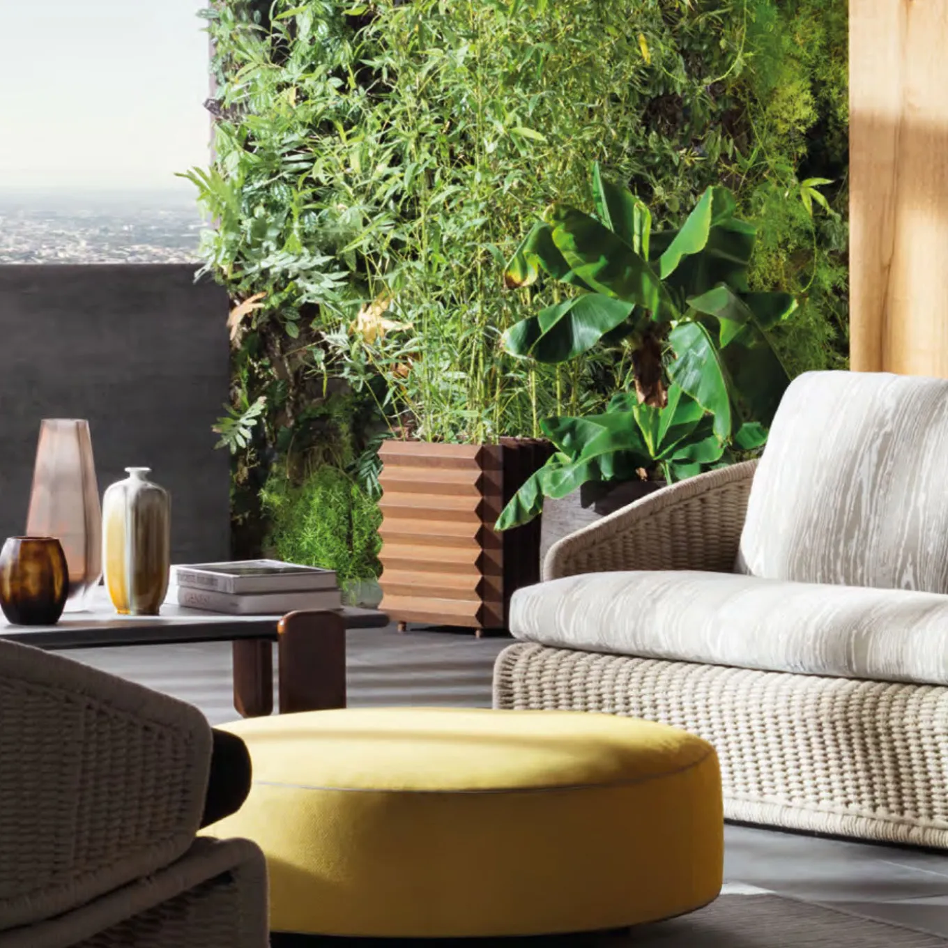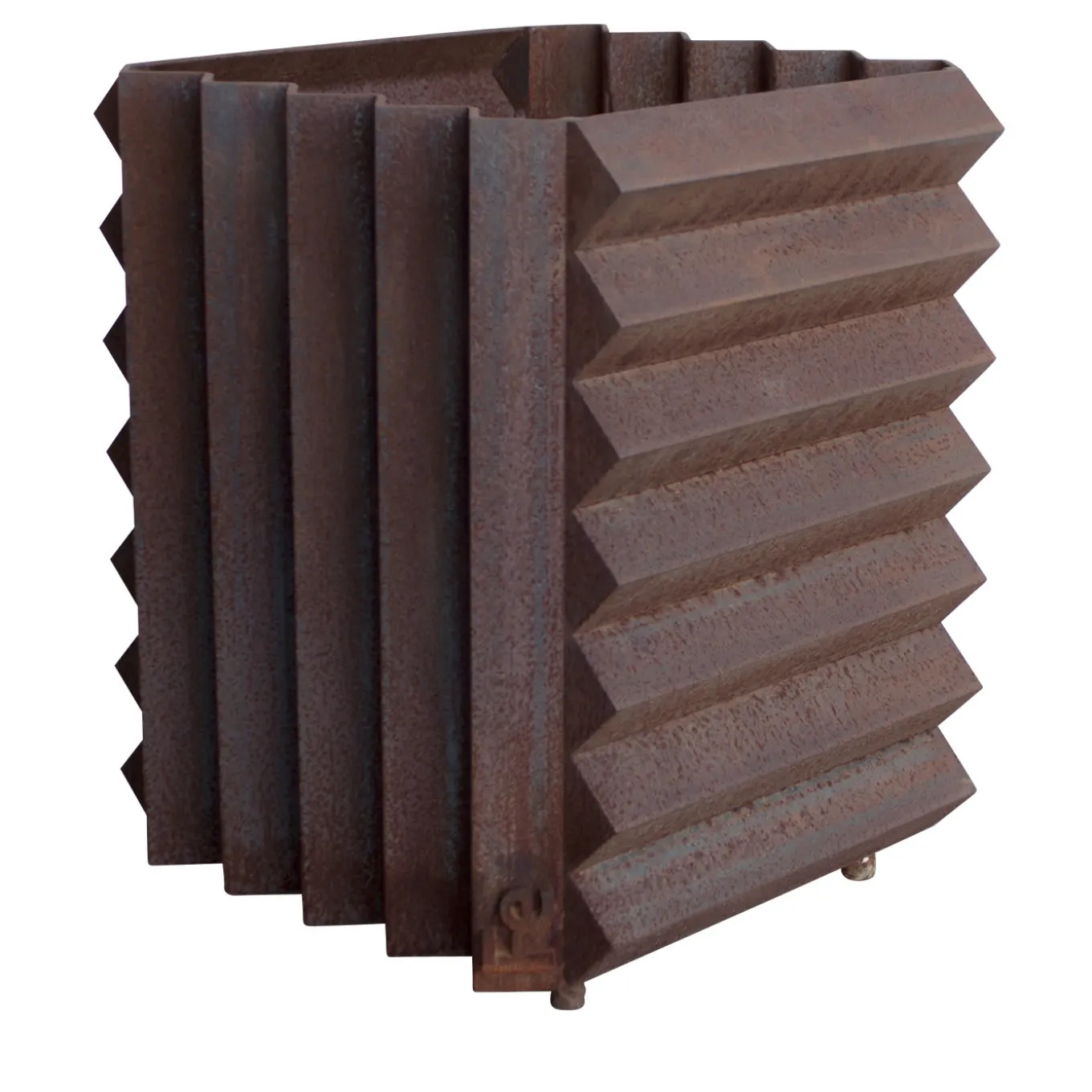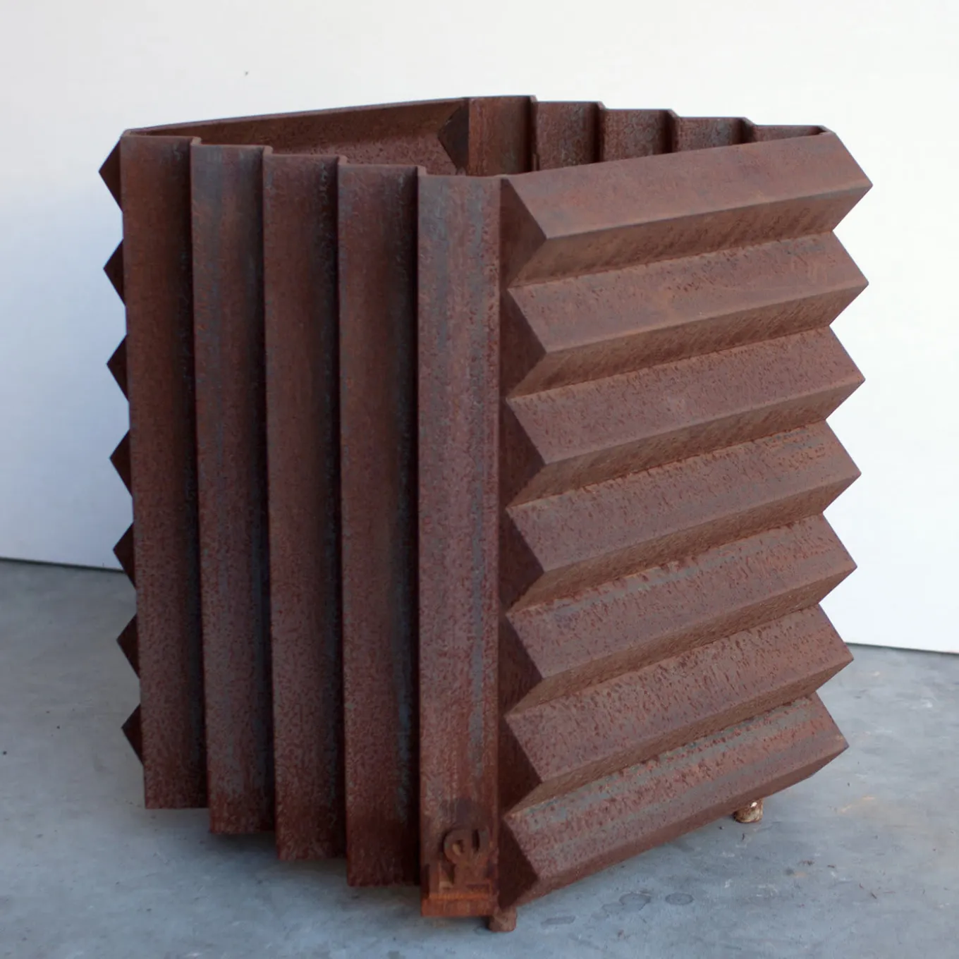 In this elegant iron vase holder with no bottom, horizontal and vertical elements harmoniously coexist. Every piece is welled with an artisanal method that creates a one-of-a-kind object. The surface is finished with a treatment that allows a thin layer of rust to deposit and create hues and nuances unique to each piece that oxidizes and changes color in time. The metal naturally releases particles that can be visible on light or porous surfaces.