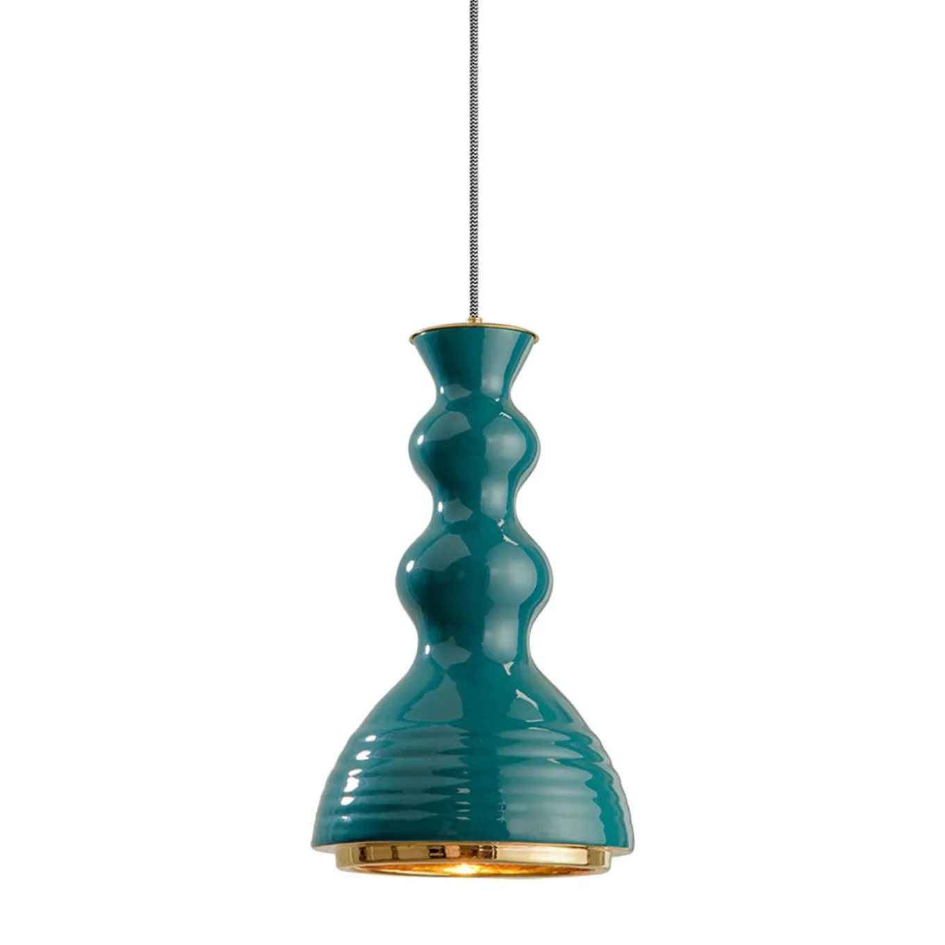 Part of the Allegra Collection, this pendant lamp is a triumph of curves immediately delivering the design’s lively character. The sinuous majolica silhouette flaunts a glossy teal finish on the outside, while the inside reveals a plush golden tone particularly emphasized when the light is on. Completed by a delicate channeled texture at the base, it comes in different look options.