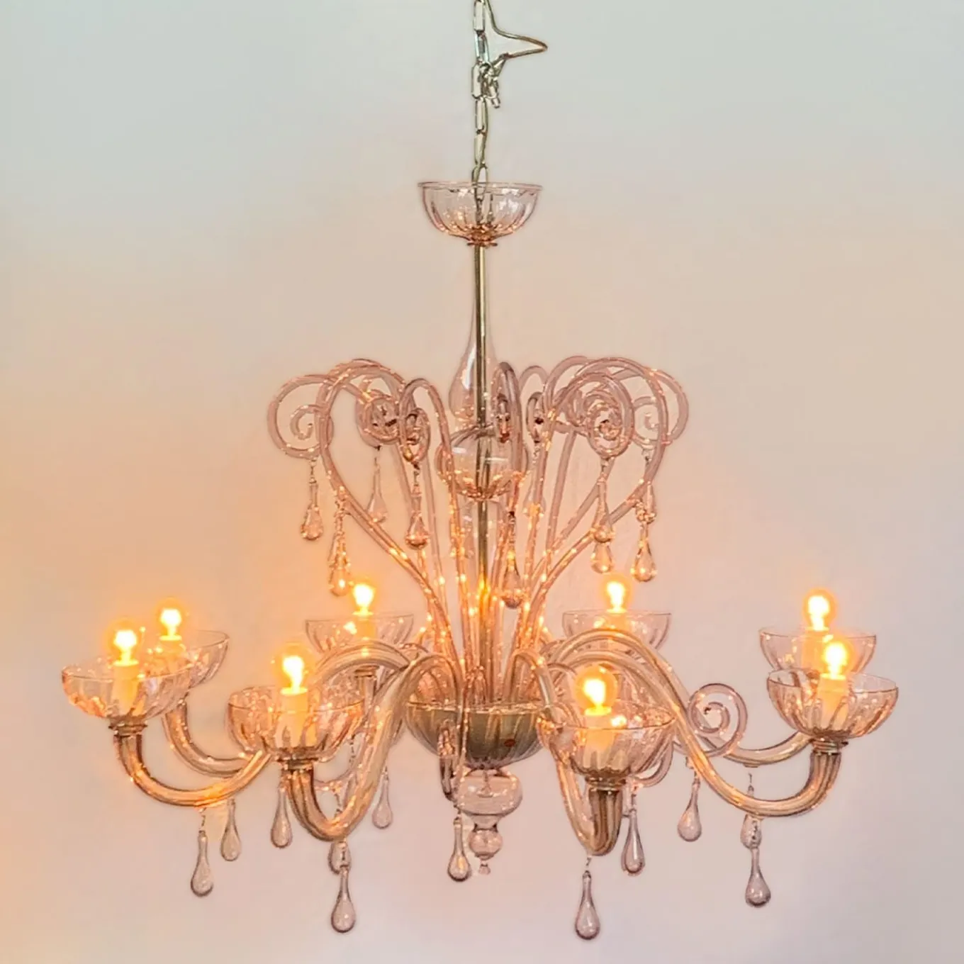 A one-of-a-kind hand-crafted Murano glass chandelier in a unique light purple hue. Created by a master glassmaker from the renowned Toso studio in the 1990s, this piece showcases exceptional craftsmanship with clean lines and ornate details. Slight variations in color and shape are characteristic of handmade items. Featuring 8 lights with E14 fittings. This chandelier exhibits a captivating color-changing effect, shifting from vibrant purple to a soft brown-purple hue when illuminated.