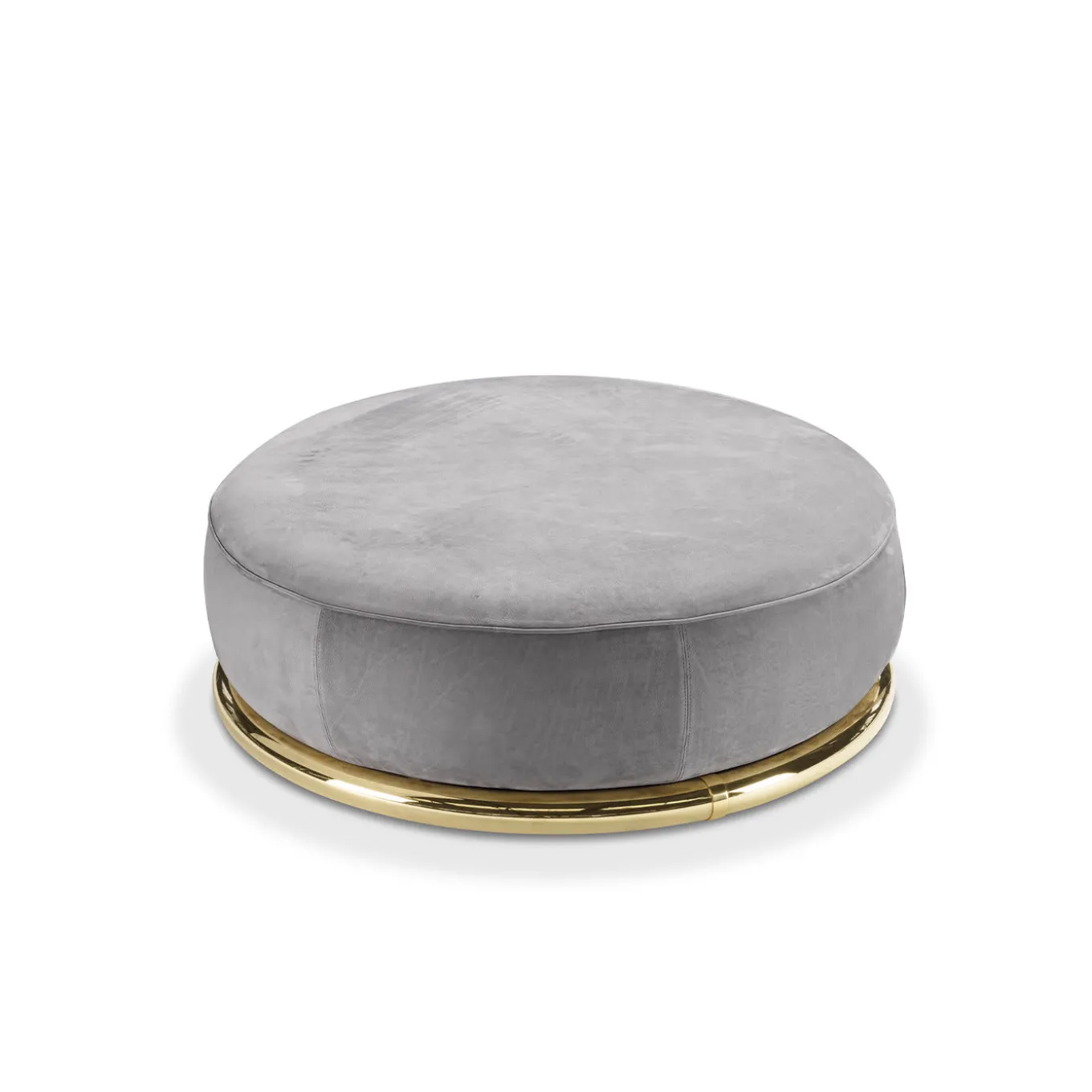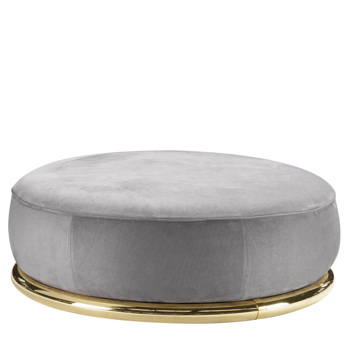 A modern interpretation of the iconic and sleek shapes of a classic ottoman, this magnificent piece flaunts a round silhouette entirely upholstered with fine gray-colored leather. The perfect match to the gray sofa from the Abbracci series, it will create a welcoming and comfortable corner of relaxation in any modern or traditional home. The piece rests on a sturdy base in polished gold-finished brass. For the US market, please contact the Concierge for CAL TB 117 certified fabrics.
