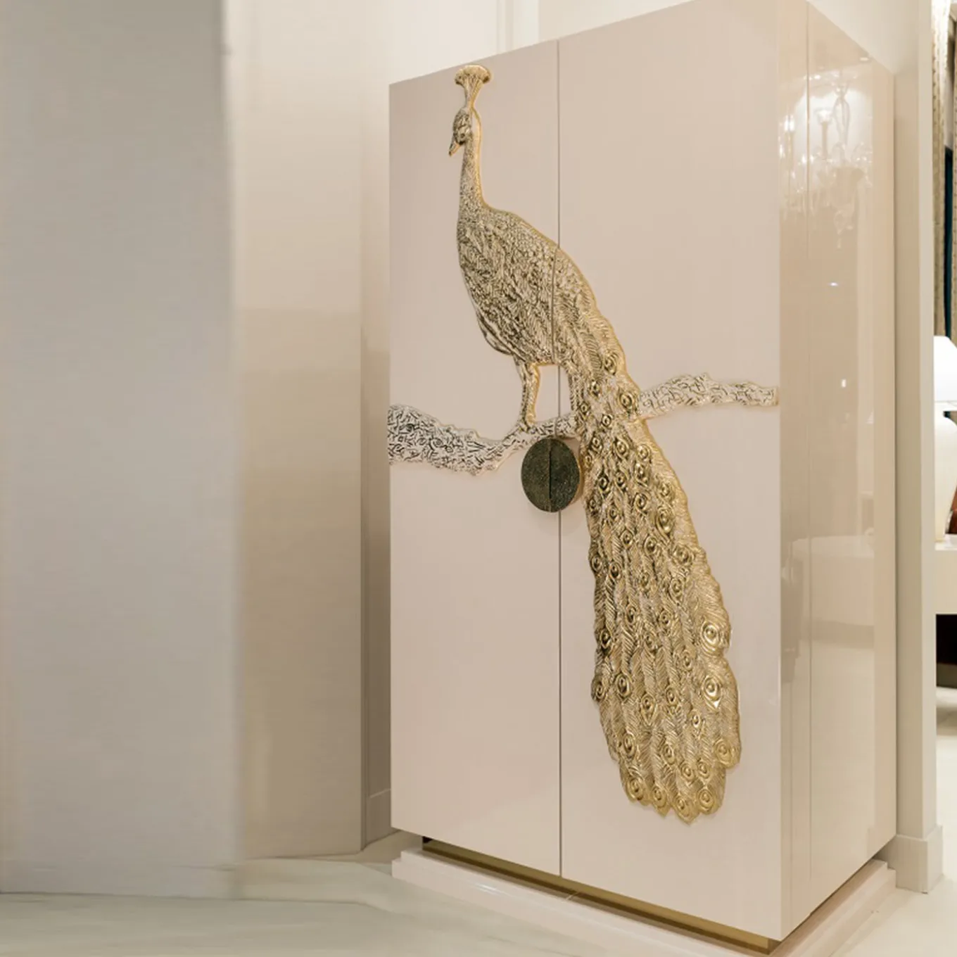This luxurious cocktail cabinet is available in a number of colors to suit the client’s interior decor needs. The sleek silhouette in high gloss white lacquer paired with its decorative facade depicting a stunning gilded peacock confers bold, artistic allure. Raised on a gold-detailed plinth base, the doors are equipped with two semi-spherical brass handles that form a circle when the closed and the interior shelving in coordinating gilded finish has mirrored back.