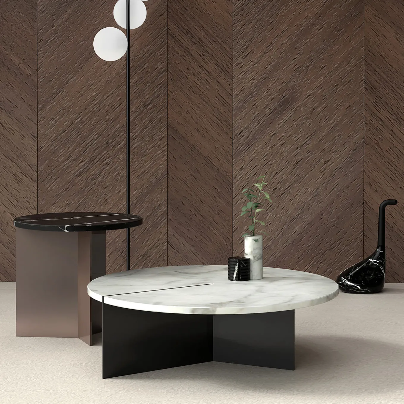 Three bronzed metal sheets converging to a dynamic base immediately reveal this coffee table’s minimalist allure. Sealed by a round top in prized Marquinia marble, its sleek silhouette suggests a spot-on positioning in refined contemporary-style living rooms or private studies. Please contact the Concierge for different size options as well as for a variant with Carrara marble top and bronzed base.