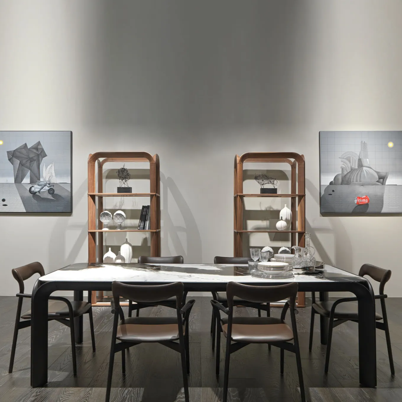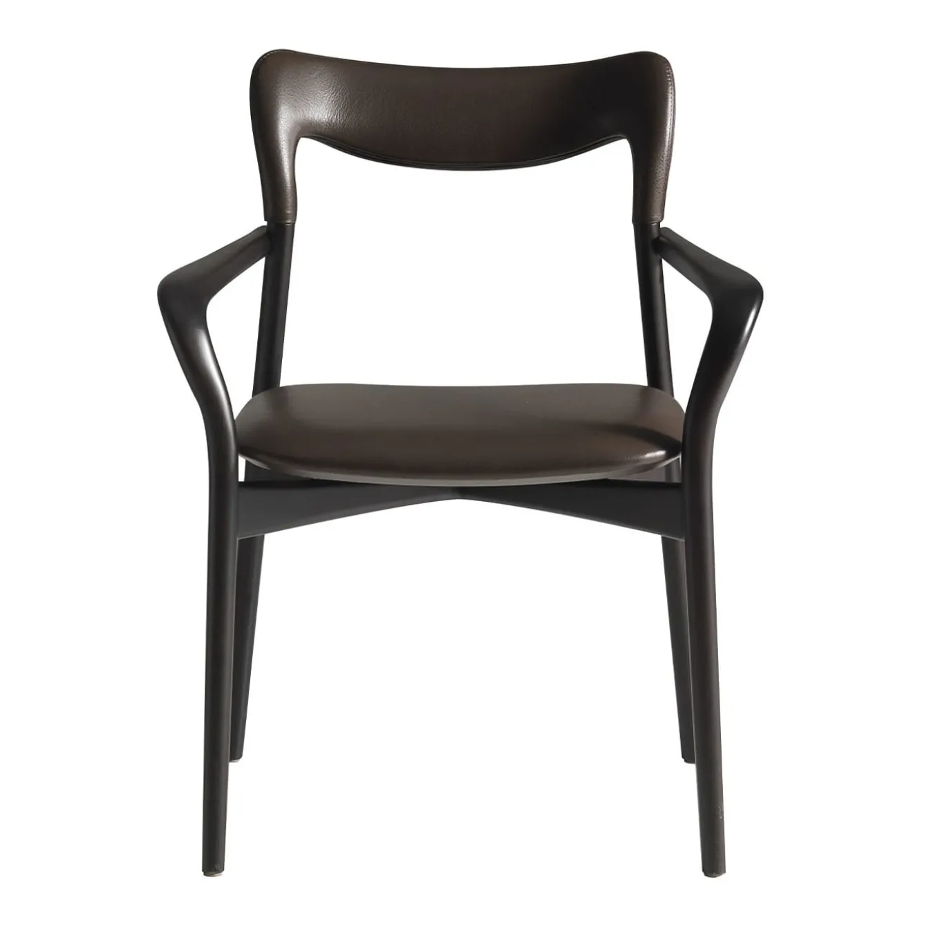 Fluid profiles fashioned of fine Canaletto walnut and entirely covered in prized EME Lena dark leather distinguish this sophisticated chair. Ideally gathered with twins around contemporary dining tables for a precious sartorial flair, it promises impeccable comfort thanks to its clever combination of ergonomic lines, padded seat, and soft leather upholstery.