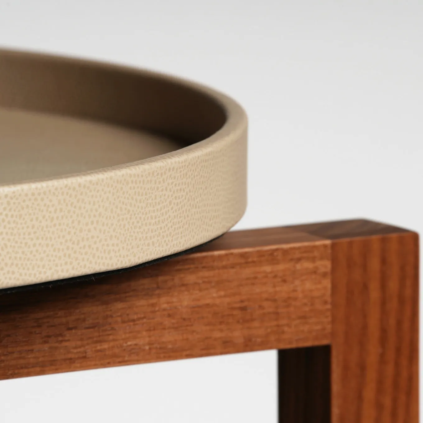 Understated yet versatile, this exceptional valet stand is a must-have accent piece in a bedroom or guest room. The slender silhouette, fashioned entirely of Canaletto walnut, features three legs in a triangular formation joining at a common center highlighted by circular, marble plate covered in leather. Two dainty rods with satin brass finish connect two of the legs, perfectly suited to hang a pair of pants, skirt, or stockings. This piece can be entirely customizable, from the leather to the finishes, please contact the Concierge for details.