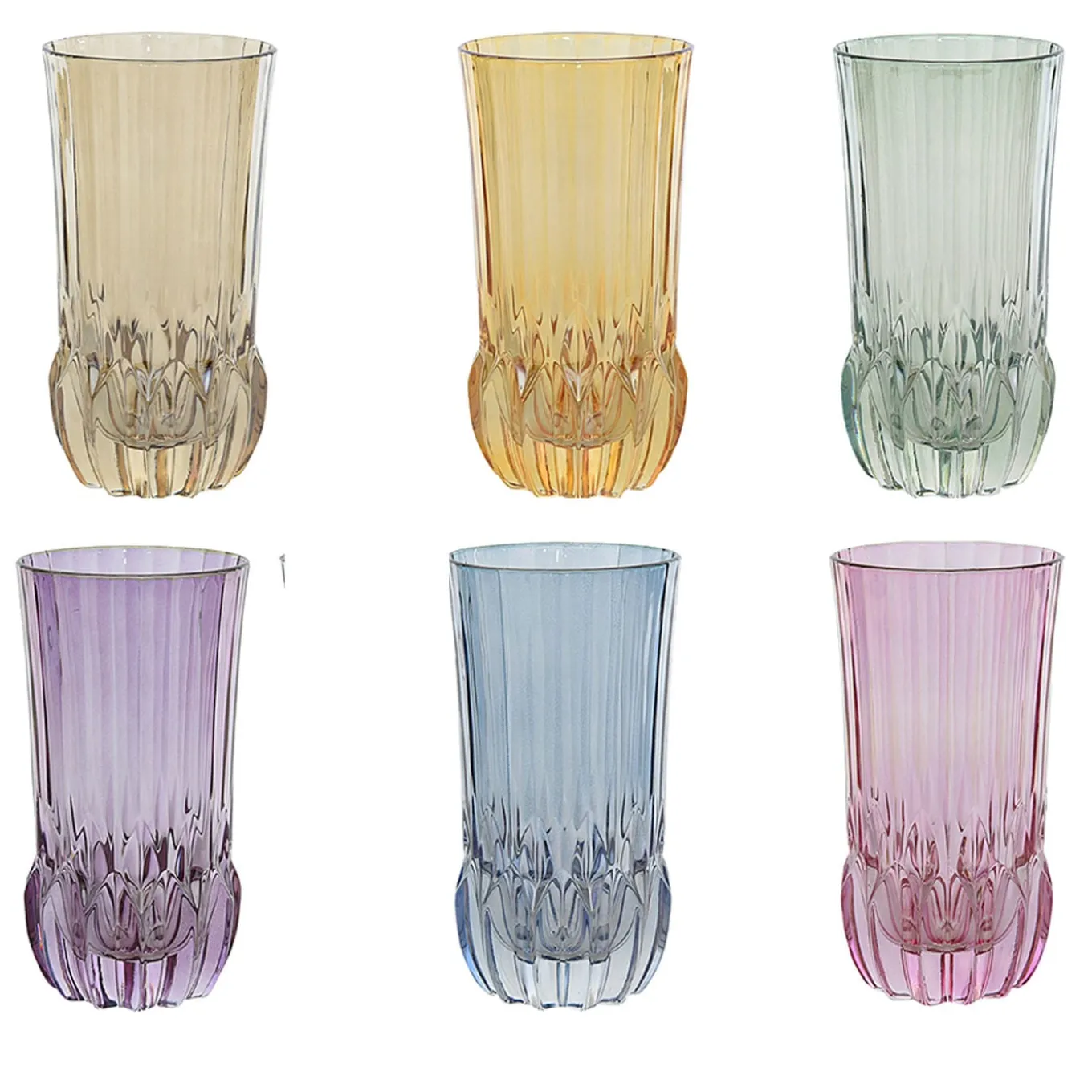 A superlative showcase of craftsmanship, this stylish and elegant set is a versatile addition to a modern or traditional home, used to serve a variety of soft drinks on an everyday basis. Showcasing a classic-shaped grooved silhouette handcrafted of mouth-blown glass, each piece flaunts a different brilliant and translucent color.
