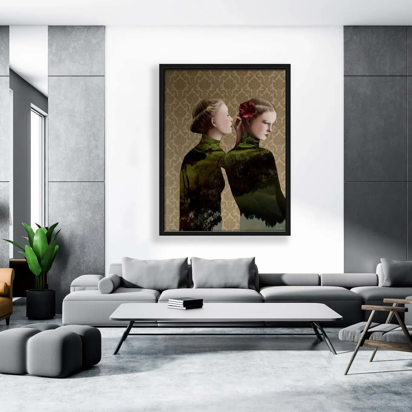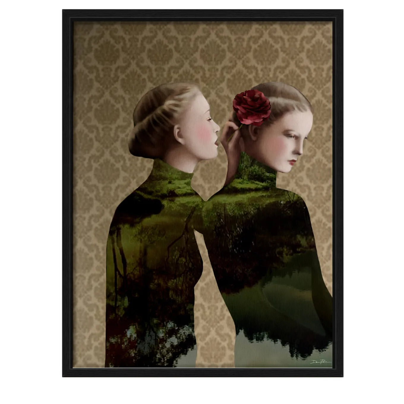 This Limited Edition, Pop-Surrealist digital artwork is made by assembling photographs and illustrations into a collage. This sensual piece features two elegant, identically dressed women, one of whom intimately whispers into the ear of the other. Numbered and signed by the artist with a Certificate of Authenticity. Printed on fine cotton canvas with a basswood box frame.