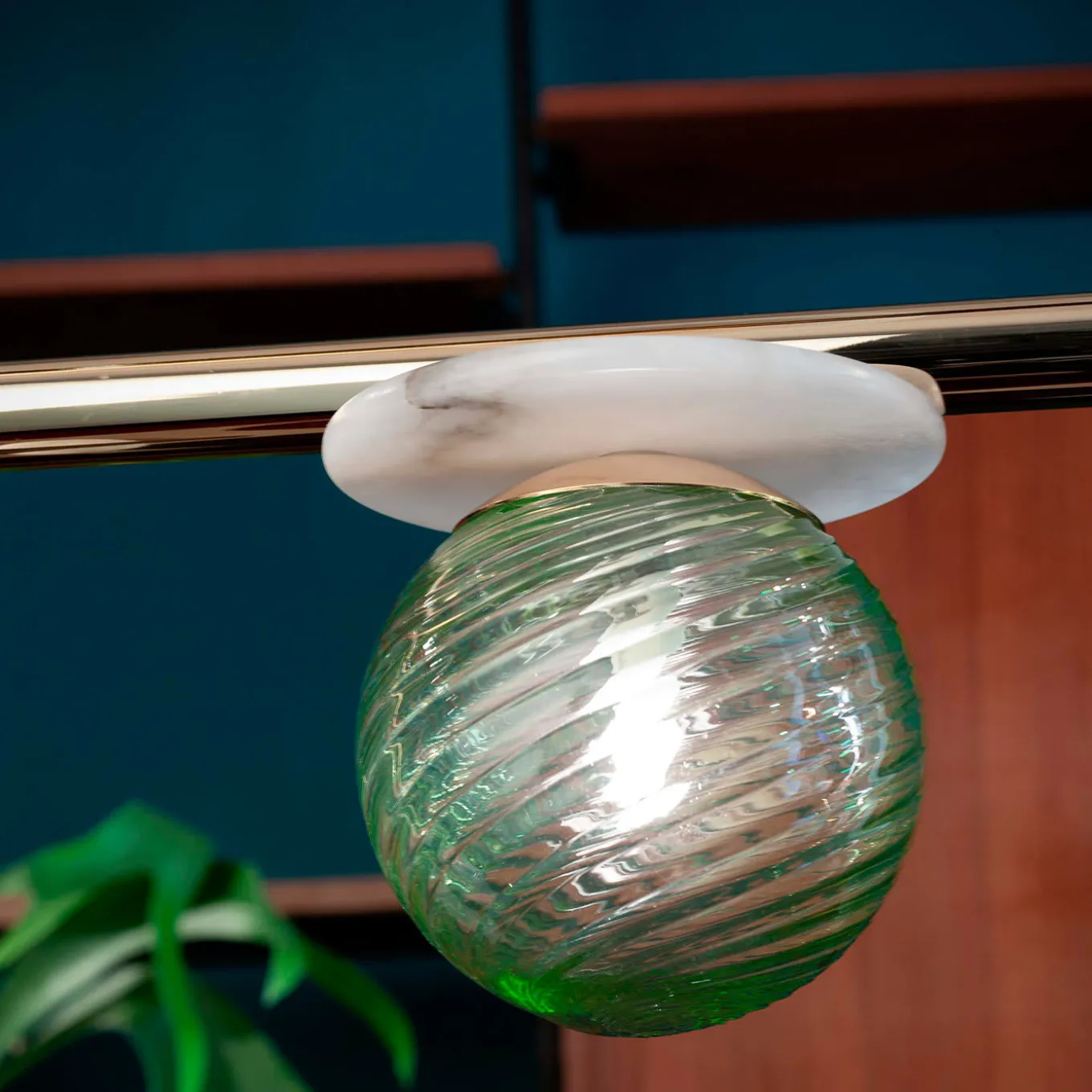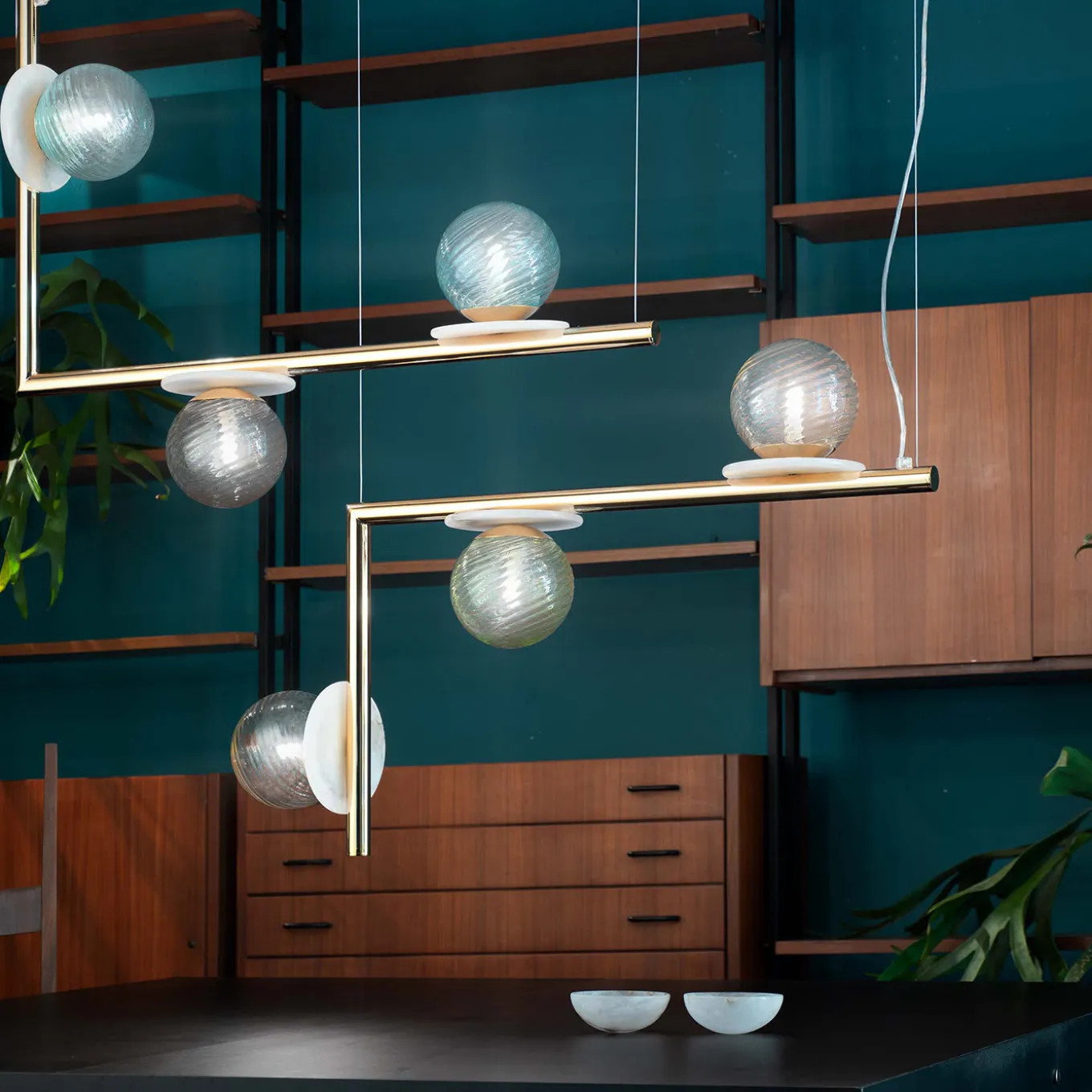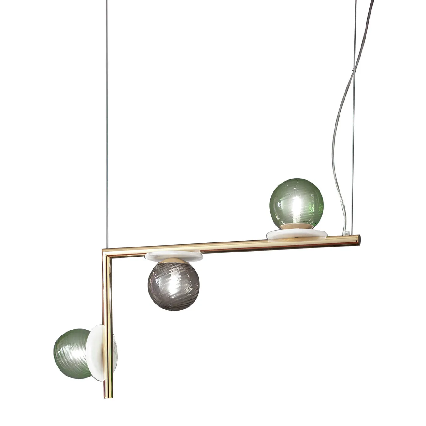 Elegant and whimsical at the same time, this pendant lamp couples century-old Murano glassblowing artistry with contemporary flair. Three multicolor spherical diffusers in Murano glass marked by a knotted texture are mounted on white alabaster disks turned by hand, distributed along the L-shaped metal frame with a glossy finish. Light radiates from three G9 LED bulbs. Please inquire with the Concierge regarding color customization options available.