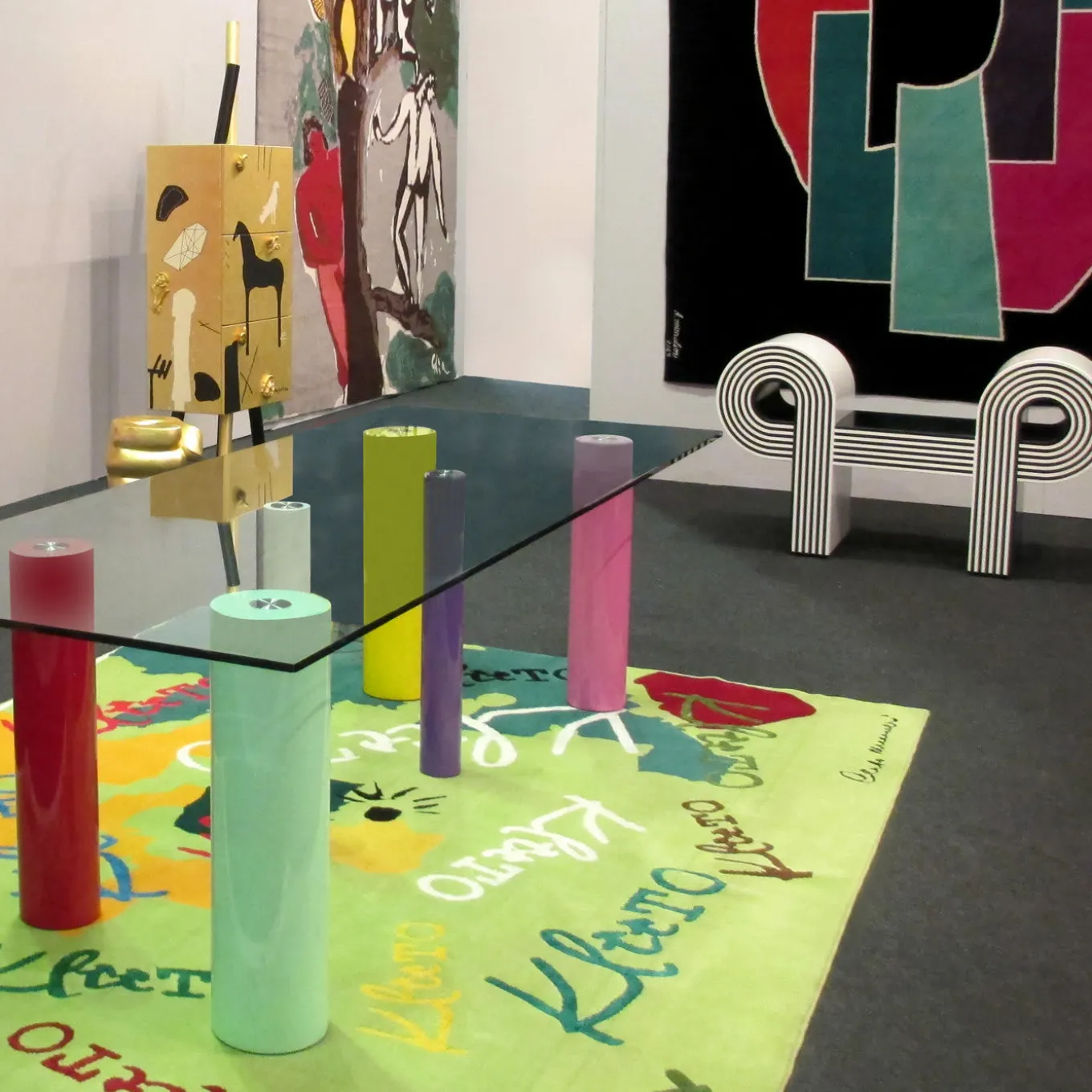 This brightly colored rug will make a striking statement when placed within a contemporary setting, whether in the home, office, or public space. It was hand crafted in Turkey using fine linen, wool, mohair, and silk and it was designed by Cleto Munari. It is part of a limited series of only 29 specimens. Multi-colored decorations grace its surface making is a joy to behold.