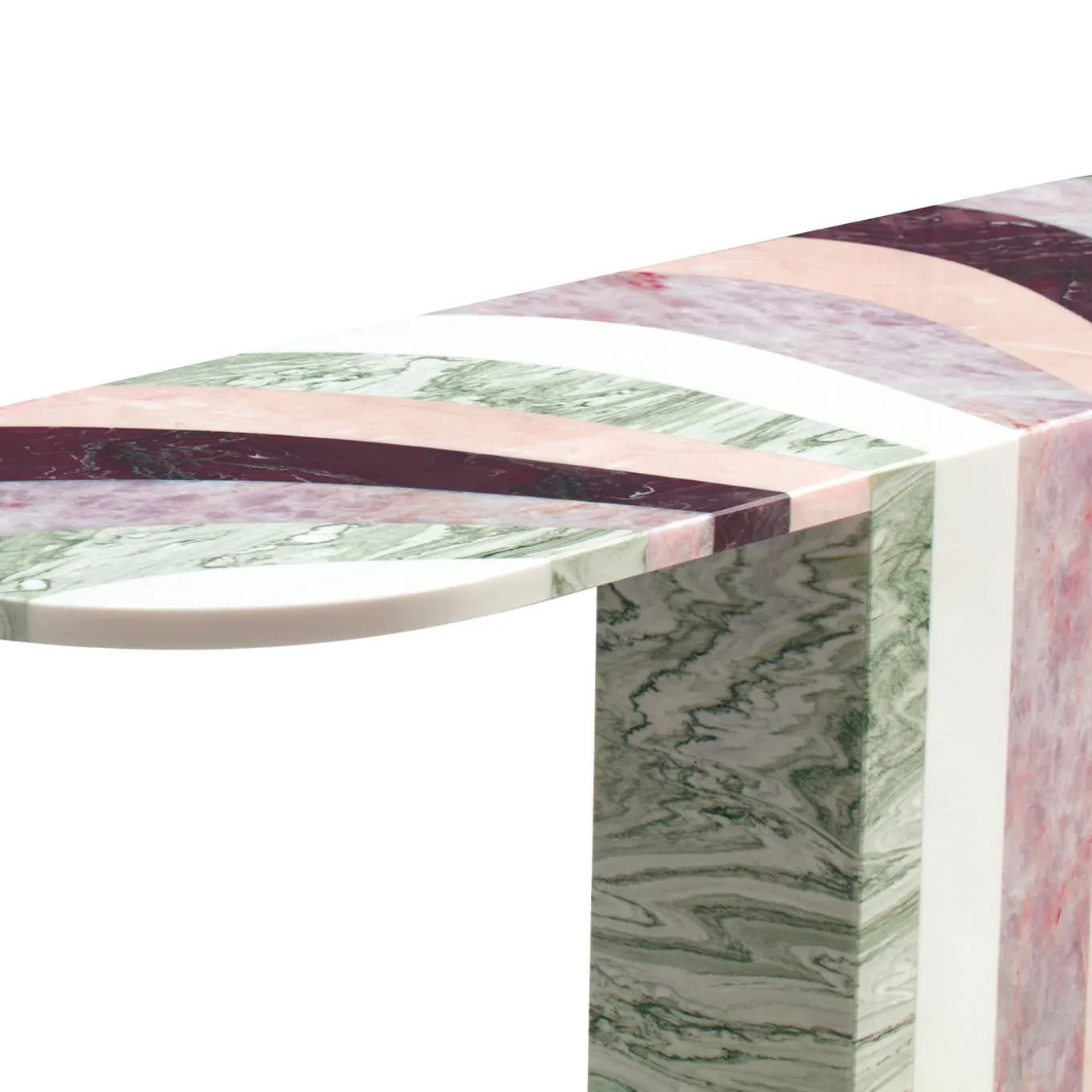 An extraordinary ultra-modern interpretation of the classic console, this highly functional piece belongs to the Agua Collection by Patricia Urquiola. Boasting a curvy biscuit shape top and a monolith-type leg base, this exquisite objet d’art is characterized by the six types of refined marbles whose gorgeous hues flow in graphic continuity from top to bottom. A true work of master craftsmanship and design, this console may be paired with other elements by the same designer to create a stunning impact in a contemporary interior.