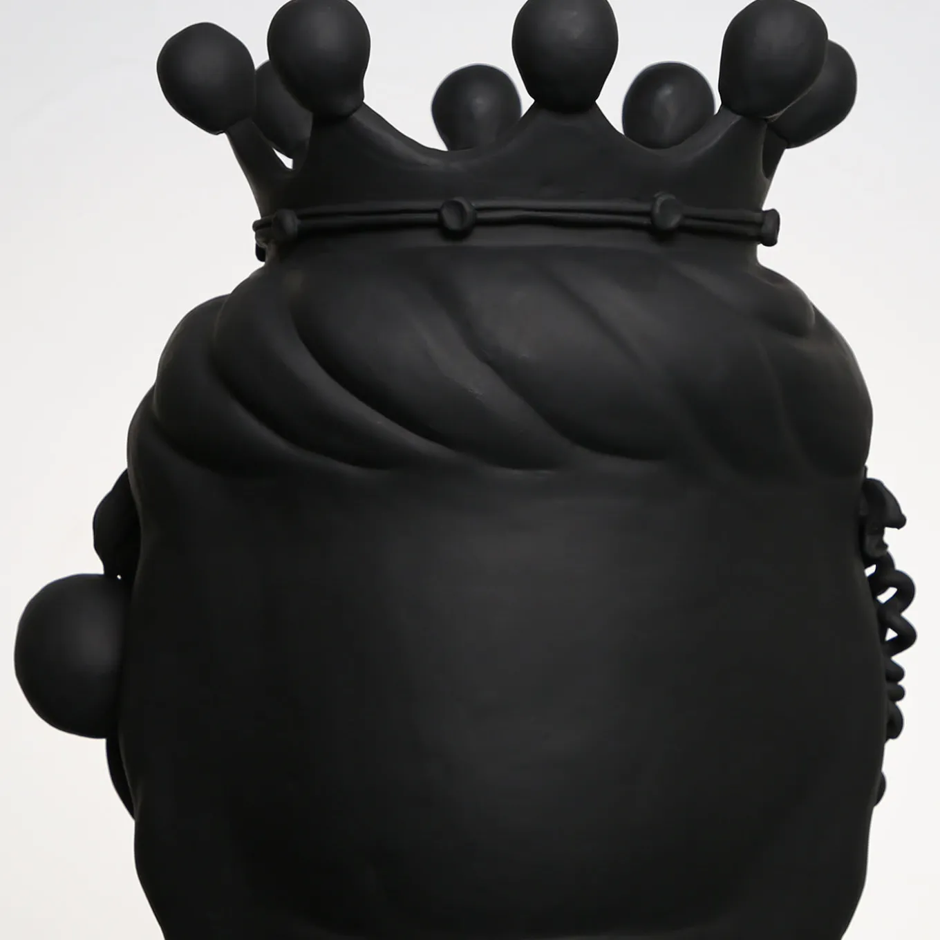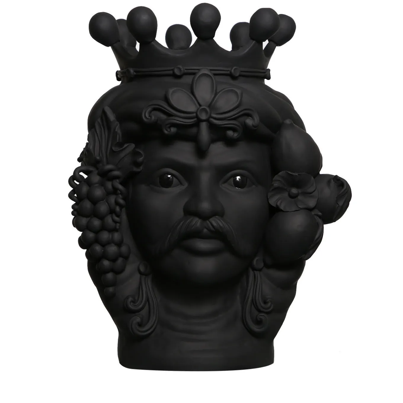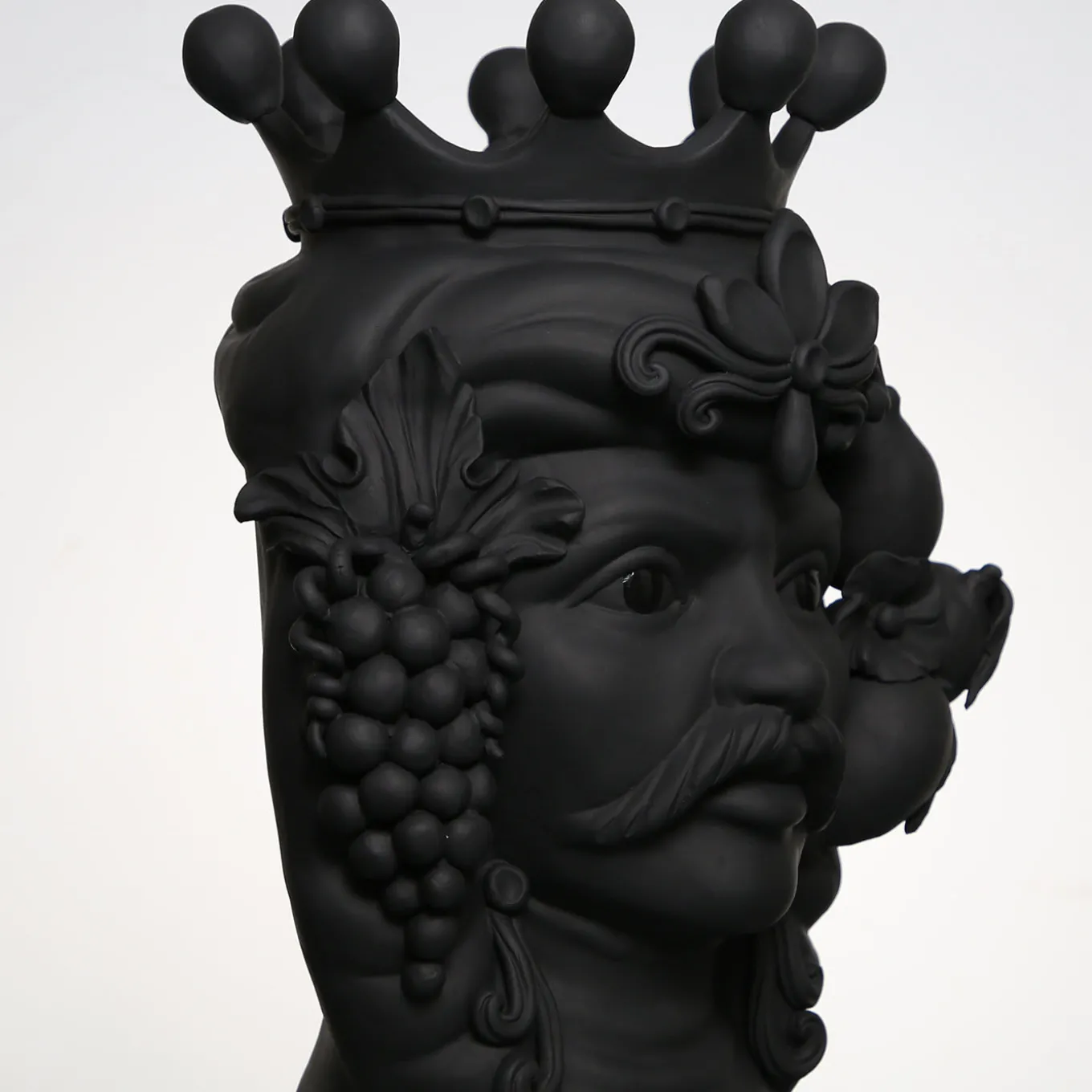 This anthropomorphic vase is made entirely by hand and painted in a black matte monochrome tint, rich in natural pigments and resin binders that provide intense color depth. Only the eyes are glazed so they stand out, emphasizing the beauty of the gaze. The piece is inspired by ancient Sicilian legends of love and revenge between a Moor and a Maiden. The vase cannot be filled with water.
