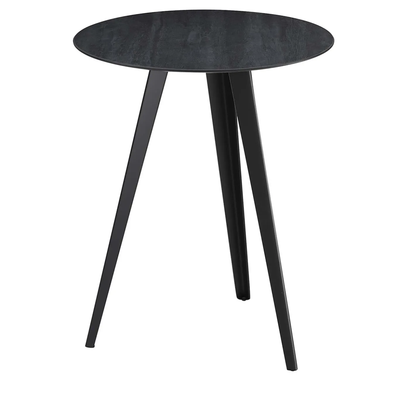 This minimalist design by Emilio Nanni will enrich both private and commercial interiors of clean and contemporary sophistication. A standout piece that features a clean and essential silhouette, it is comprised of a round top in slate resting on a captivating metal tripod comprised of three slanted legs.