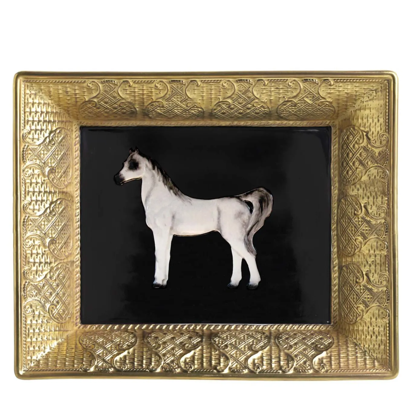 This porcelain tray depicts the Arabian horse, Al Lahab. The edges of this sophisticated, collectible item boast a minute inlay that is painted with 24k gold, while the background is painted black with a stunning reproduction of a horse gracing the center section of the tray.