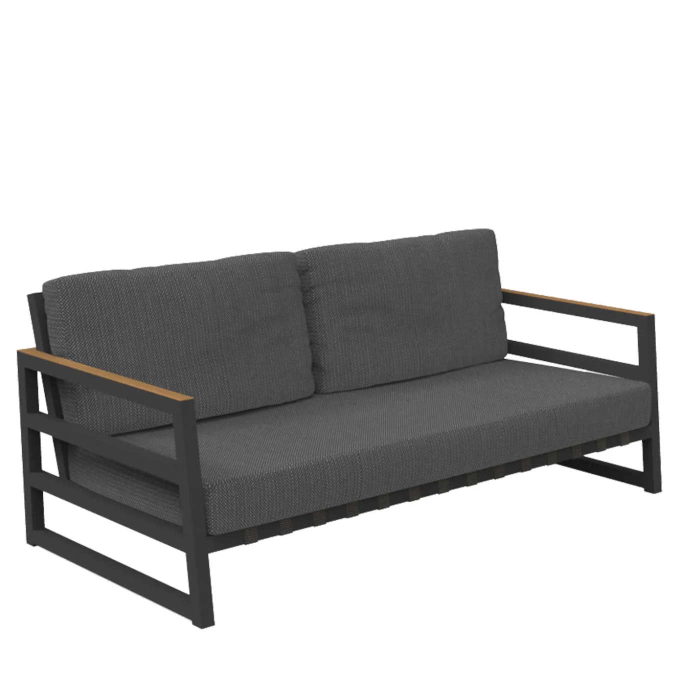 This stylish, 2-seater outdoor sofa stands out for its comfortable seat and small size, which makes for efficient use of space. Its design is warm and cozy, due to its structure in graphite aluminum and boasts beautiful teak armrests. Made in Italy by expert artisans, this item is a perfect blend of form and function. Its weather-resistant cushions feature removable fabric and quick-dry foam. Contract and commercial certifications available upon request.