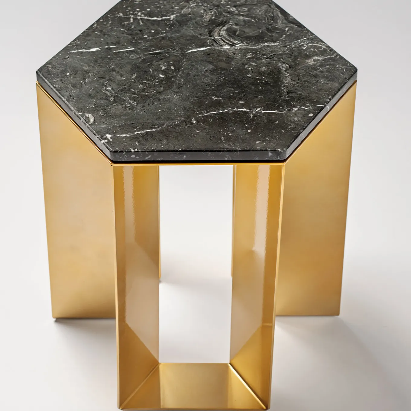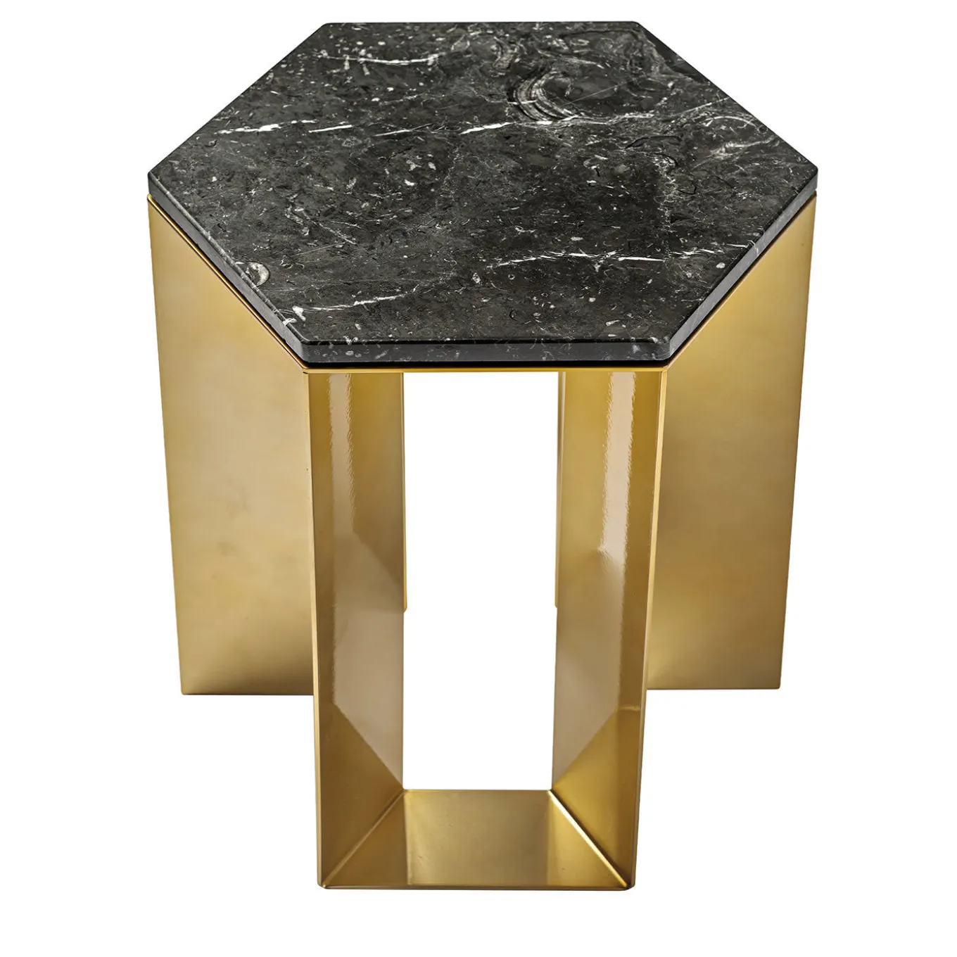 Elegant in its simple and balanced design, this side table belongs to a refined series created by artist Antonio Saporito for contemporary interiors. Clean and essential, it features a metal base lacquered in a golden hue composed of light and delicate legs, supporting an hexagonal-shaped top in black marble. Please consult the Concierge for further details.