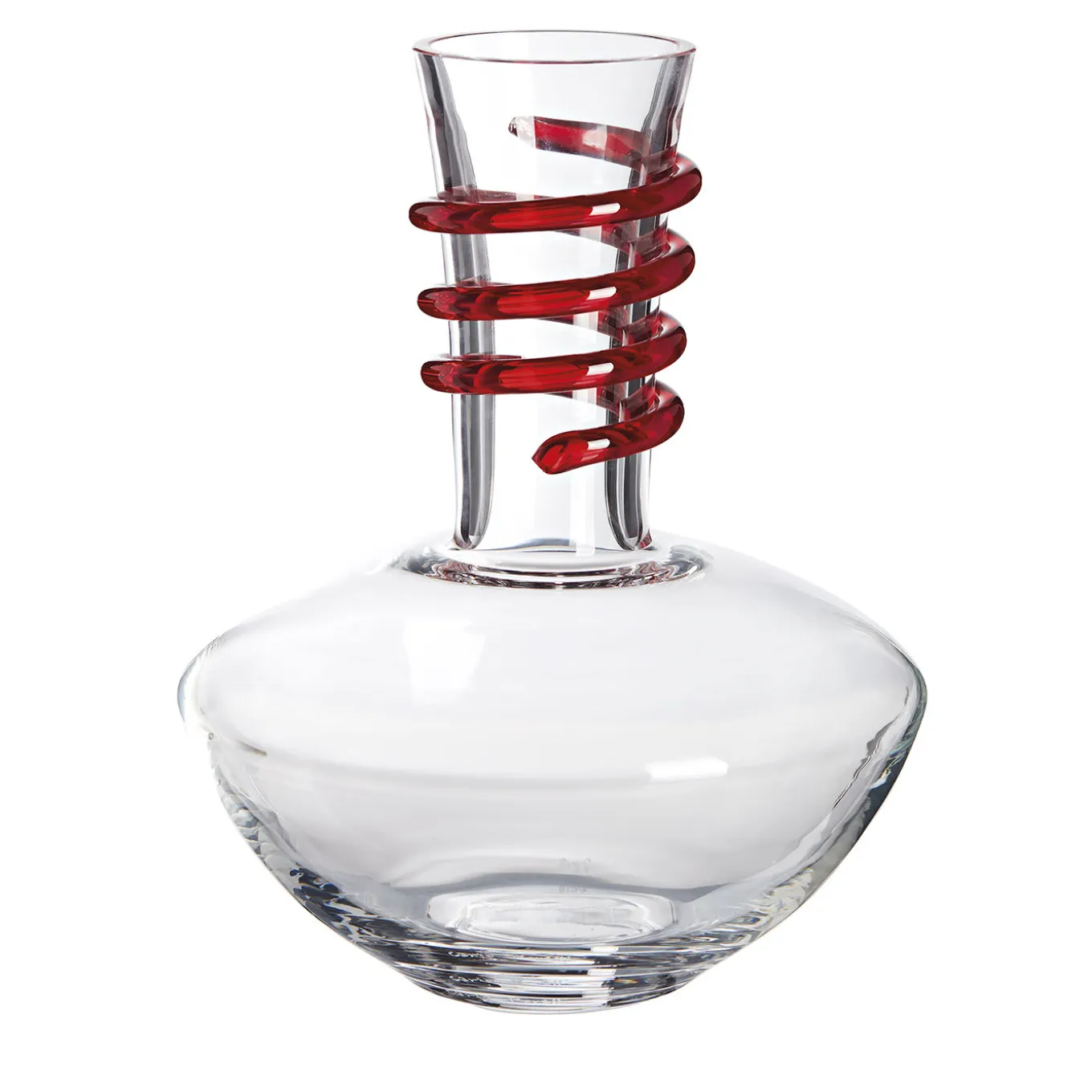 A bold and charming statement piece for a refined dining table, this wine decanter is superbly handcrafted of clear mouth-blown Murano crystal, uniquely adorned with a red crystal spiral dynamically wrapped around the neck. Striking and refined, it will make an original housewarming gift. It is signed and dated (Carlo Moretti, 2009).