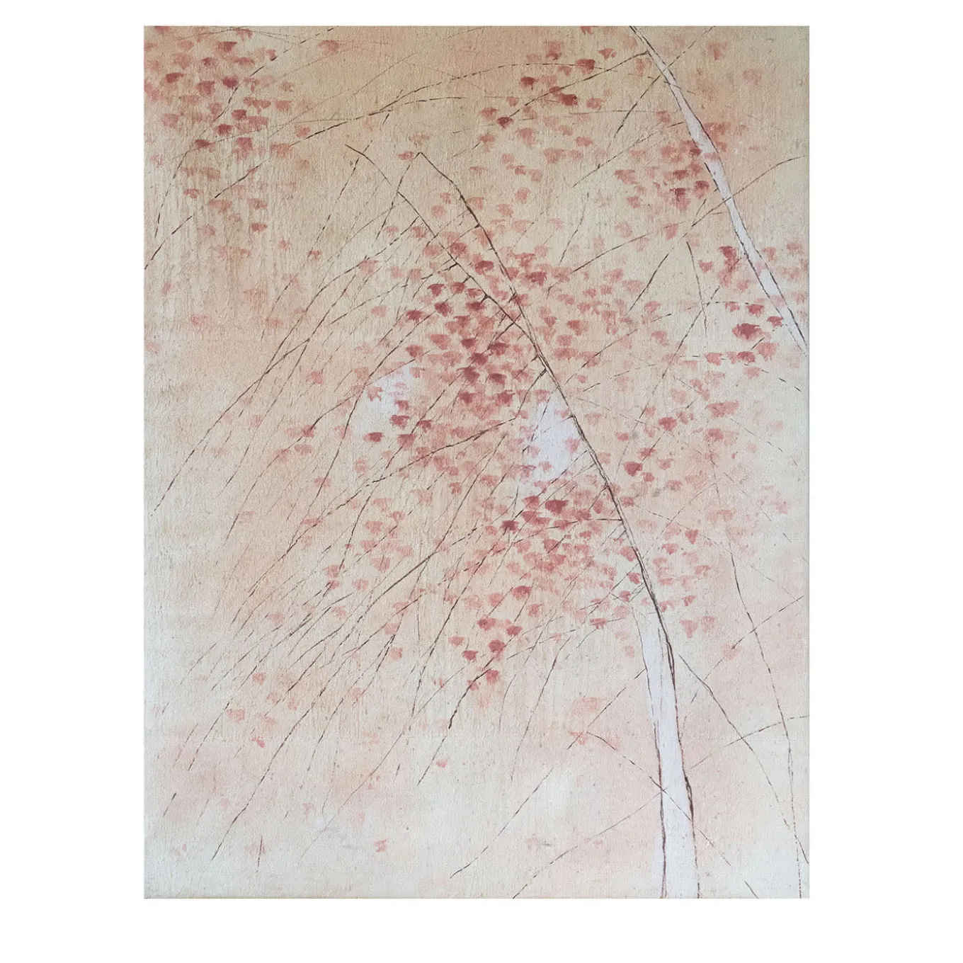 This picture painted on creased paper applied on canvas is a tribute to nature. In this pink version, through a stylistic representation, it’s expressed the light of the sunset that filters through the leaves of the branches and the wind that moves them.