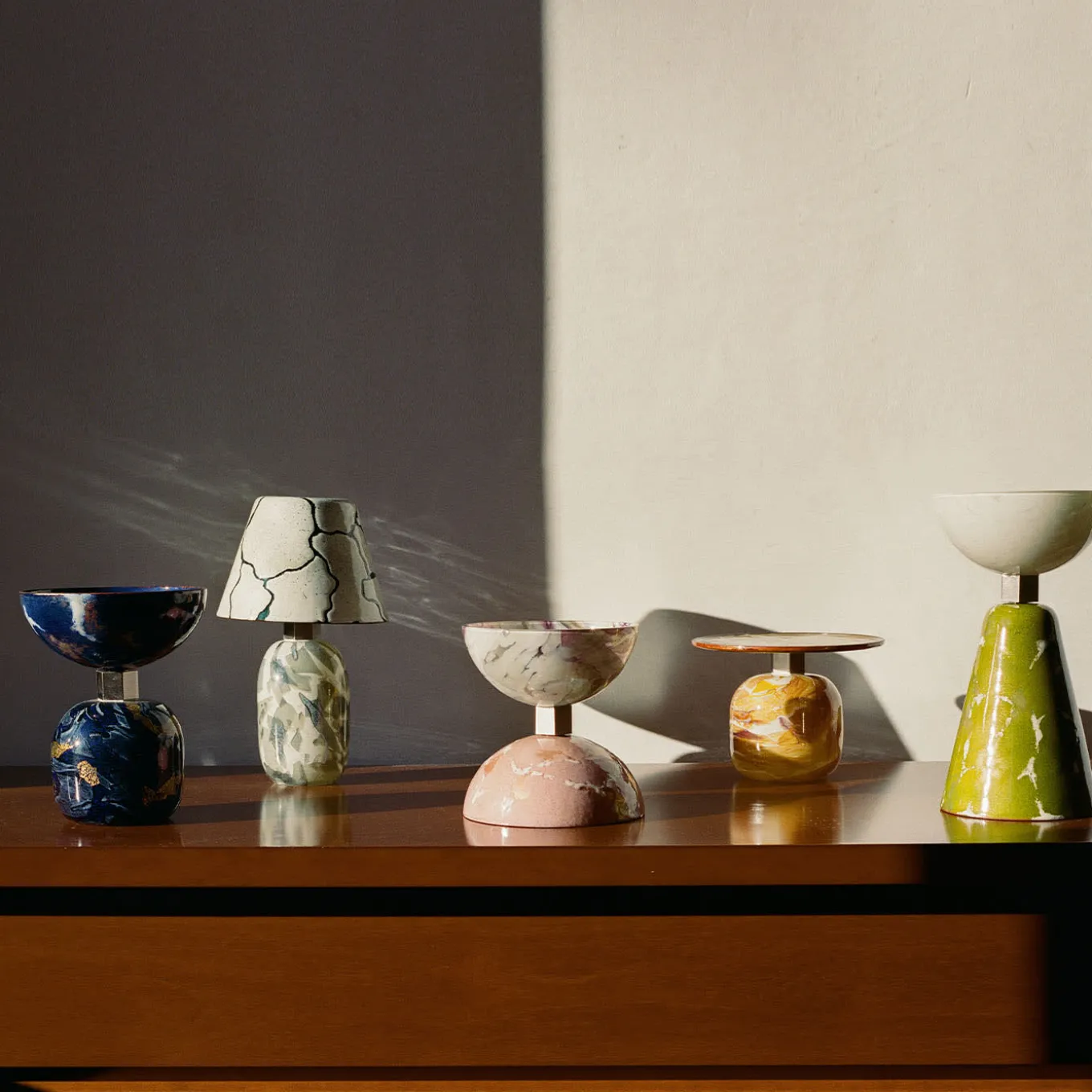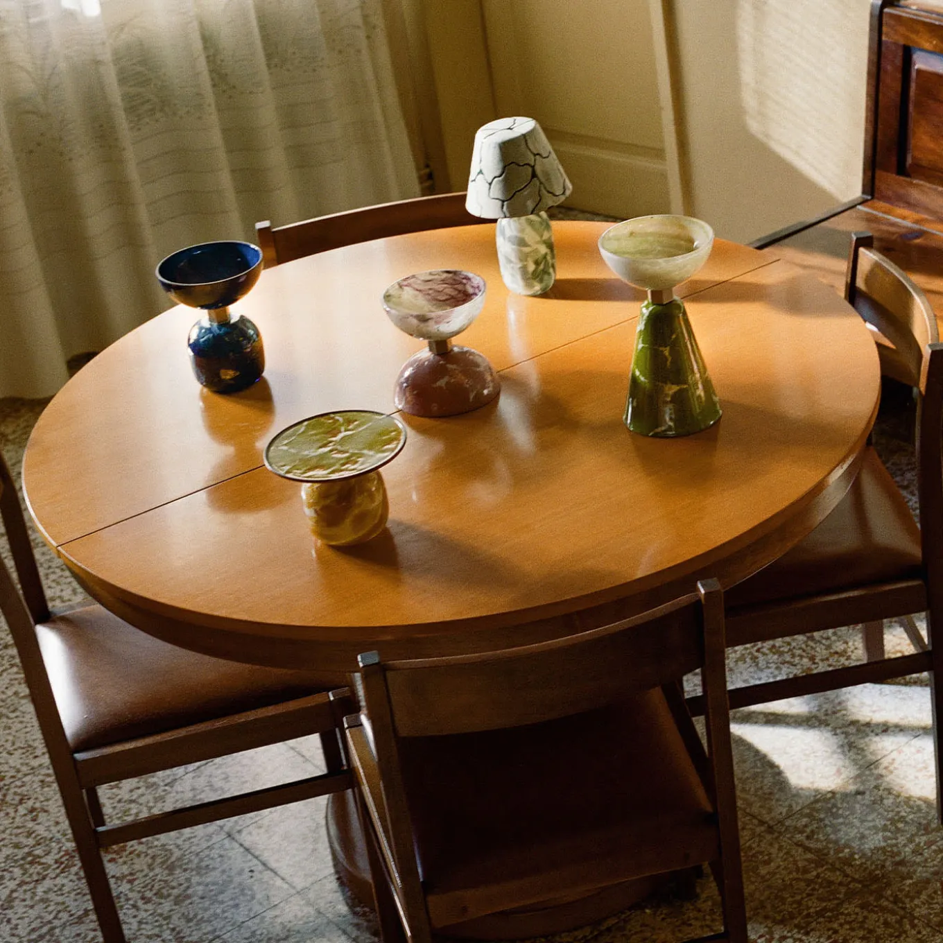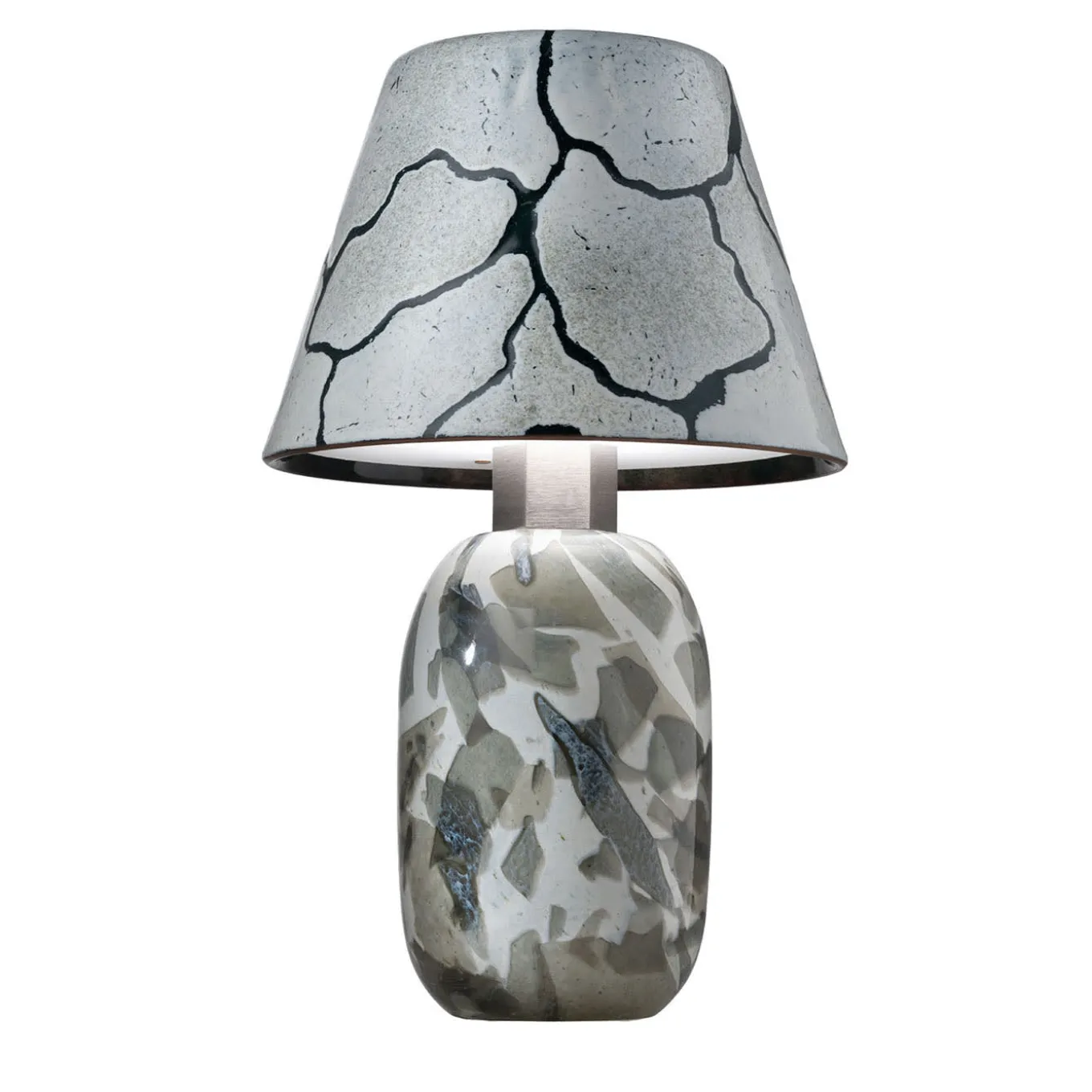 The alchimie white lamp is part of a capsule collection born from the collaboration between Incalmi and Debonademeo. This innovative collection transforms glass powder into unique objects, including vases, trays, and lamps, that showcase the potential of Murano glass and metal. The lamp evokes the textures of marble and semi-precious stones, blending tradition with modernity. It is a rechargeable high lamp, equipped with a USB cable, though the charger is not included.