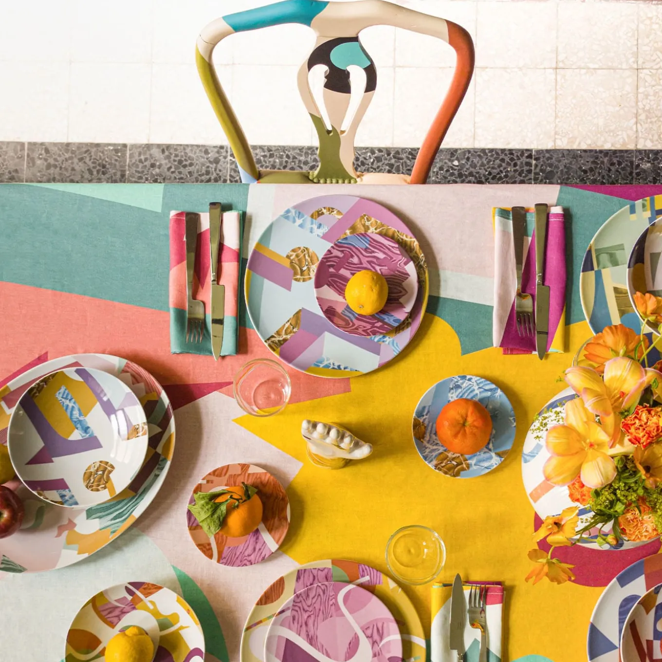 Vito Nesta and Alessandro Guerriero have created the Alchimie collection for the Grand Tour brand. This collection immortalizes many products influenced by the founder of the 1976 Alchimia studio. Vibrant colors, strong contrasts, and geometric and abstract shapes interlock, creating small universes of visual beauty. Different textures enhance the flat-color designs, making them more eye-catching and fun. This bread plate is one of six that make up the collection.