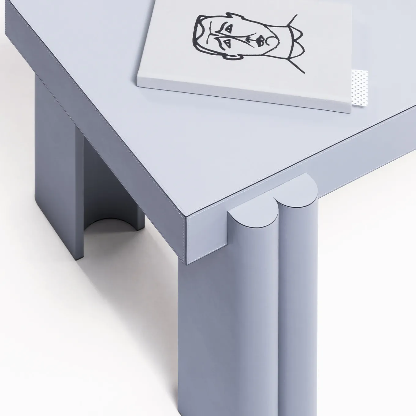 The symmetrical details of the Alfabeta Bench reveal meticulous care in all the slightest details, a trademark of all Giobagnara’s pieces. Featuring unconventional proportions and rounded forms delivering a strong character, this sculptural design is fully covered in light blue leather with concave legs supporting the imposing top recalling the architecture of Mies van der Rohe. This exclusive design by Stephane Parmentier is only available in suede, printed calfskin and nappa.