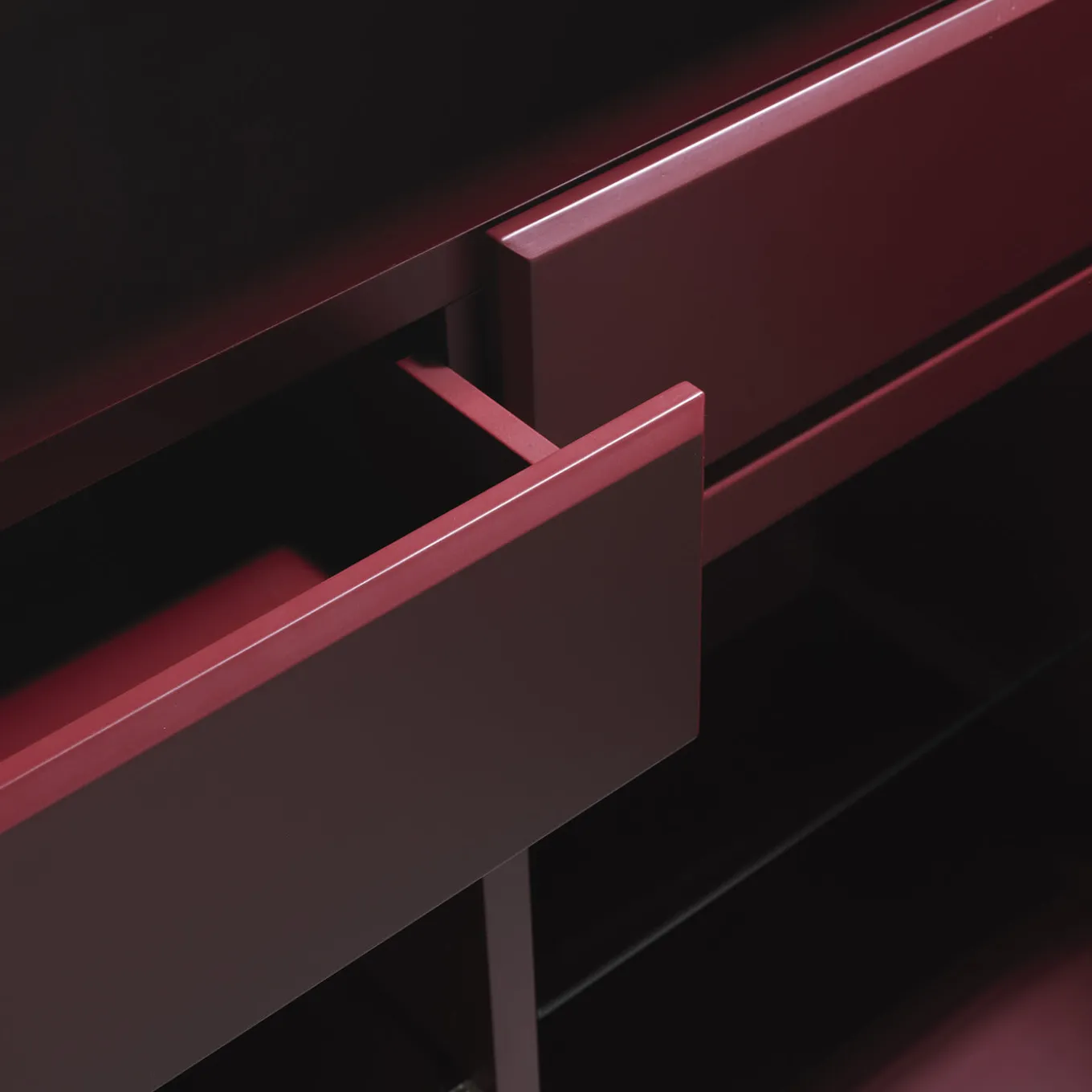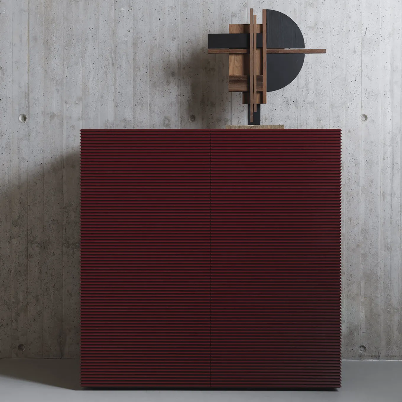 Elegant and refined, this bar cabinet will make a bold statement in a modern home. Crafted of red-lacquered MDF, it features two doors externally adorned with a handmade striped decoration of textural value, and a back-painted crystal top. Enhanced with a bright mirror, the interior features two drawers, two removable shelves, one tray, and a LED light (220/110) that turns on when the cabinet’s doors open.