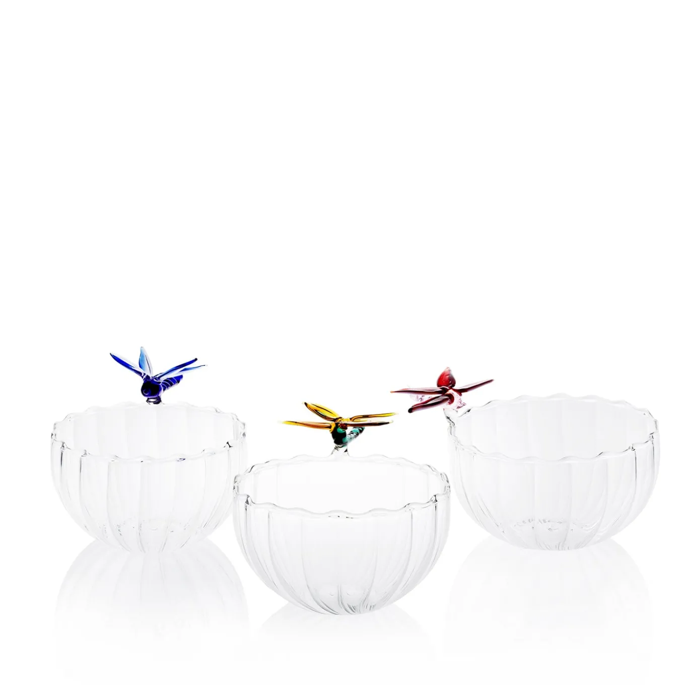 This delicately handcrafted bowl, made from transparent glass with a colored dragonfly perched on its edge, is a beautiful example of Italian artistry. Created in collaboration with Summerill & Bishop London, the dragonfly design symbolizes balance and living life fully. Available in deep blue, burgundy and pink, green, and sorbet yellow, each bowl is a unique, artisan-crafted piece from Venice, blending elegance with craftsmanship. Size: Ø 11 cm, height 6 cm. Dishwasher safe.