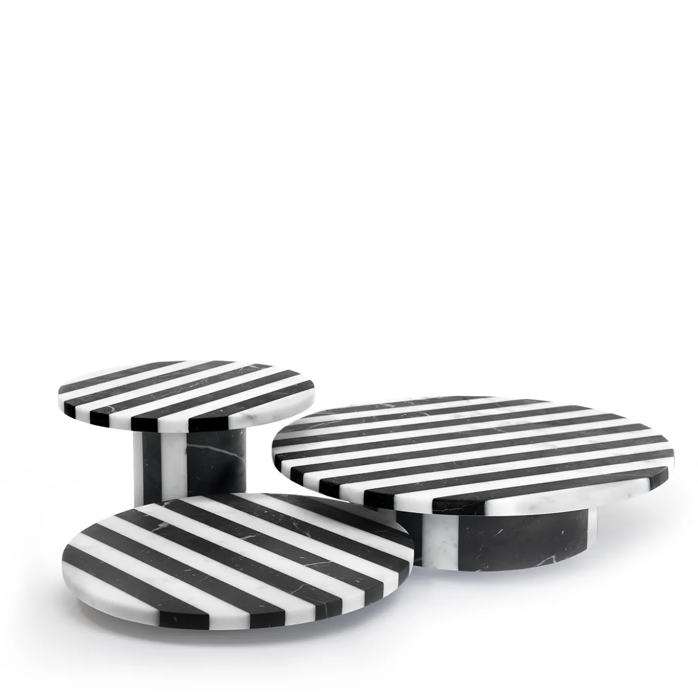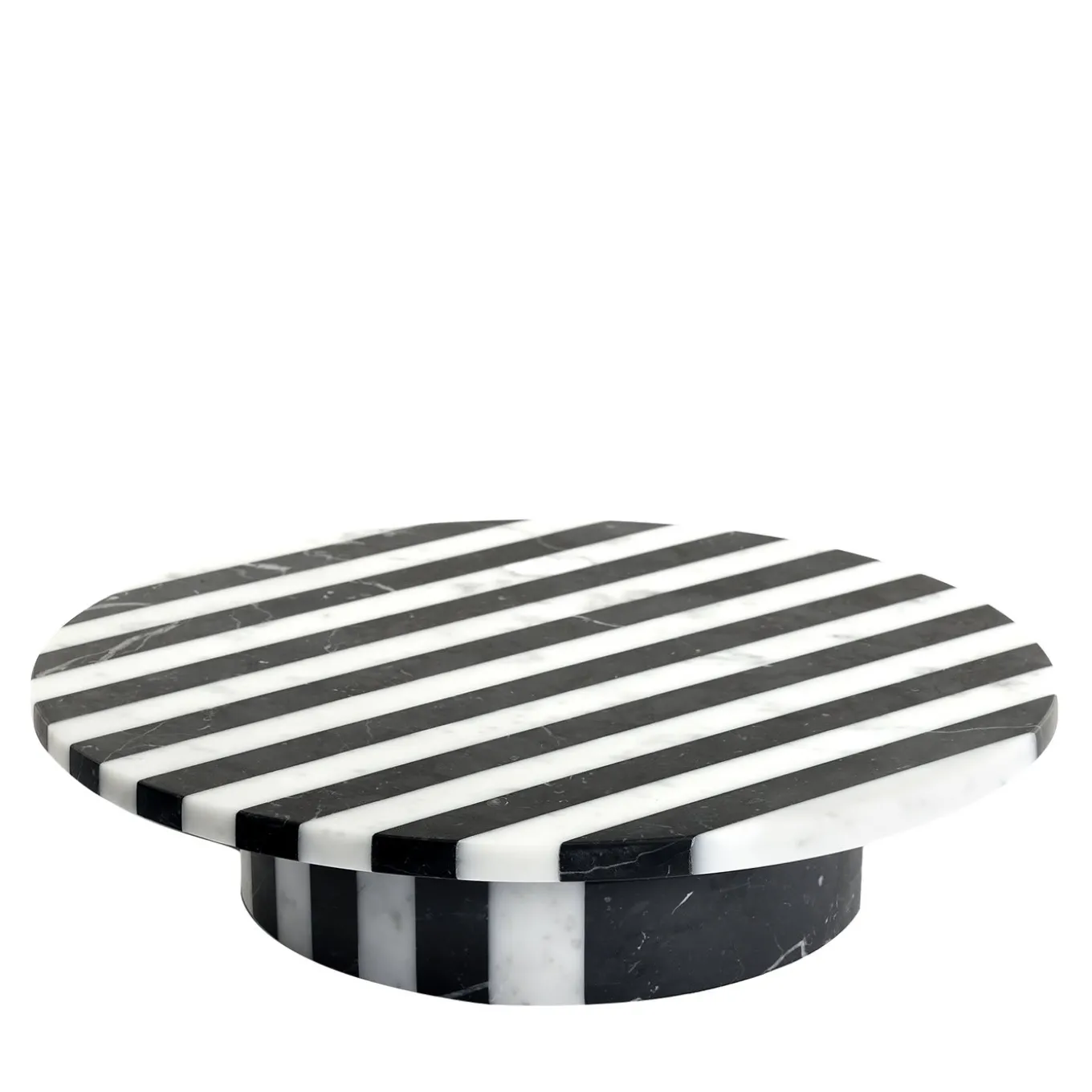 Part of the Alice Collection of pieces inspired by black-white European stone architecture, this low cake stand is the envy of every kitchen and table decor. The sleek silhouette, with its solid cylindrical base and wide circular top, is handcrafted of white Arabescato and black Marquina marbles, the dramatic color combination of the striped pattern enhancing the piece’s timeless allure and artistry. Showcased with dainty pastries, fresh fruits, or homemade snacks, this cake stand will suit any decor style and cooking necessity.