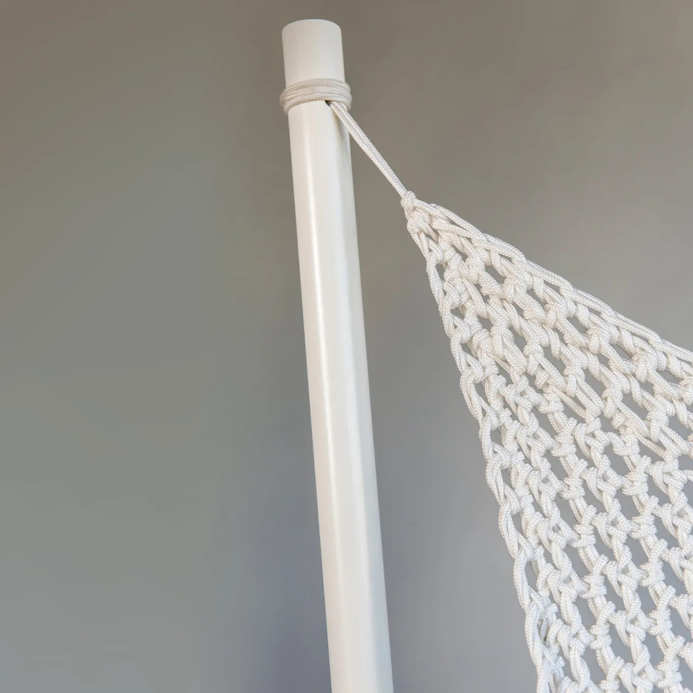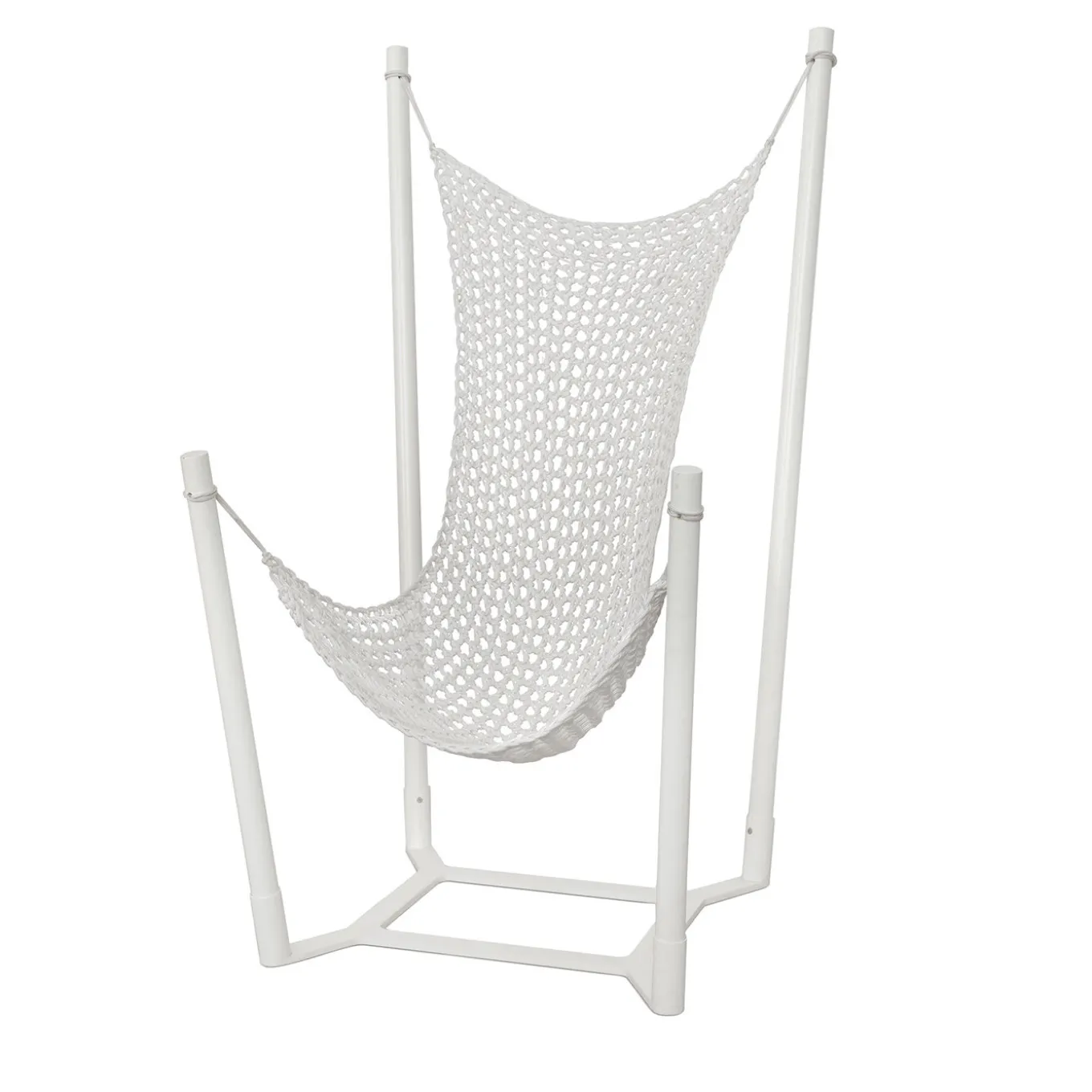 More than just a lounging chair, the Allegra updates the relaxing swing of a hammock with a comfortable design that will quickly become a favorite for both indoor and outdoor lounge areas. The white powder-coated frame provides stable support while remaining slender enough to be unobtrusive, allowing the white, hand-crocheted seat in water-resistant polypropylene technical rope to be the protagonist. The Allegra is available also in yellow with white frame, please contact the Concierge for details.