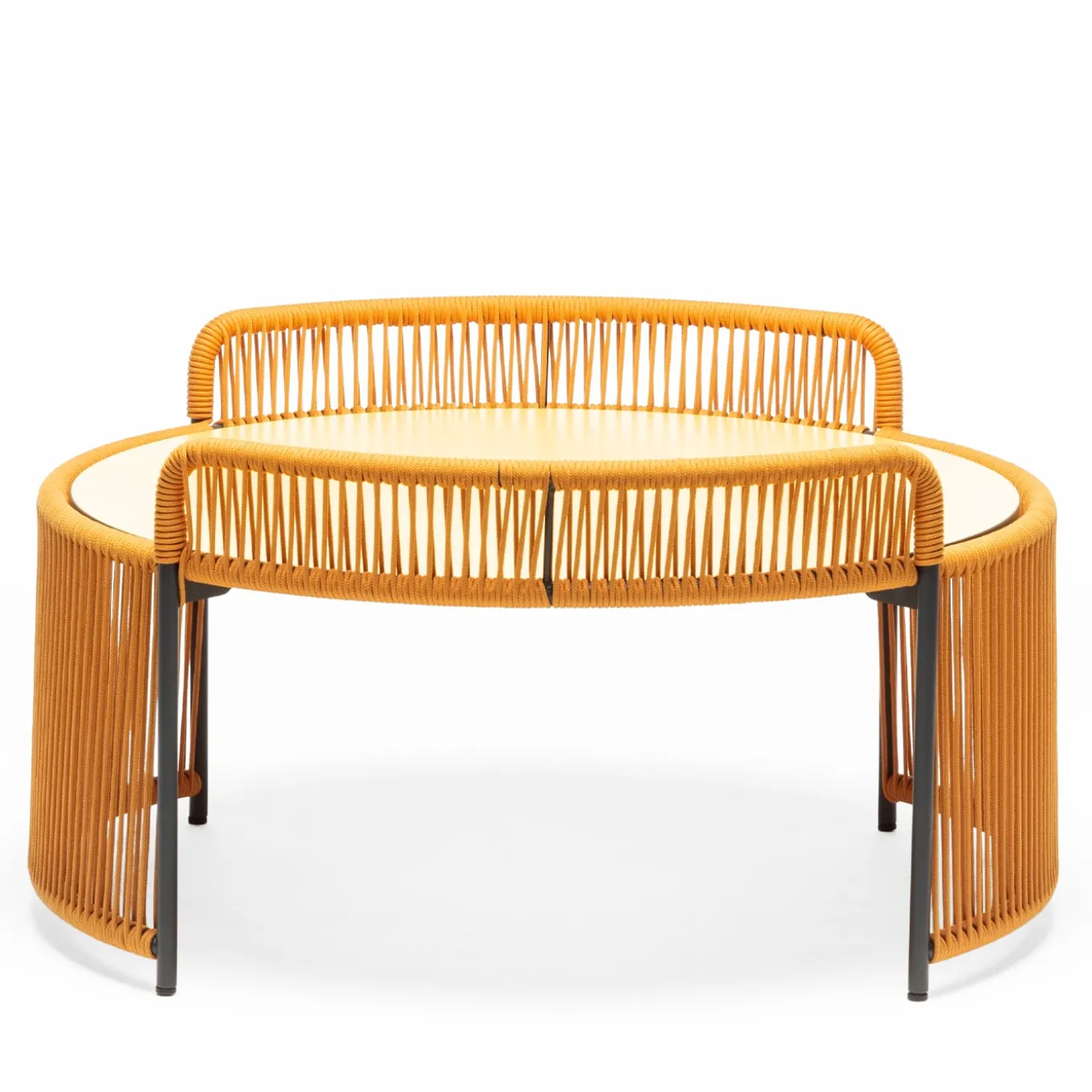 Dynamic and artful solution for laying a tray with a couple of wine glasses for a relaxed aperitif outdoors, this coffee table stands out for the intricate design of yellow marine rope deftly hand-woven and wrapped around the steel frame powder-coated in anthracite gray. A couple of curved inserts embraces the circular top in HPL. Please check the Artemest catalog for other colors, shapes, and sizes.