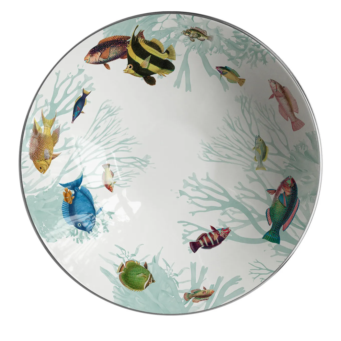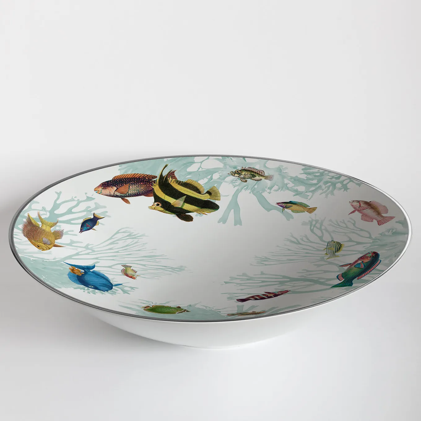 This splendid porcelain bowl belongs to the Amami Islands series named after the Japanese archipelago, and inspired by its colorful marine life. A singular piece of functional decor, it is handcrafted and painted by hand showcasing a lively school of tropical fish swimming in a captivating round pattern.