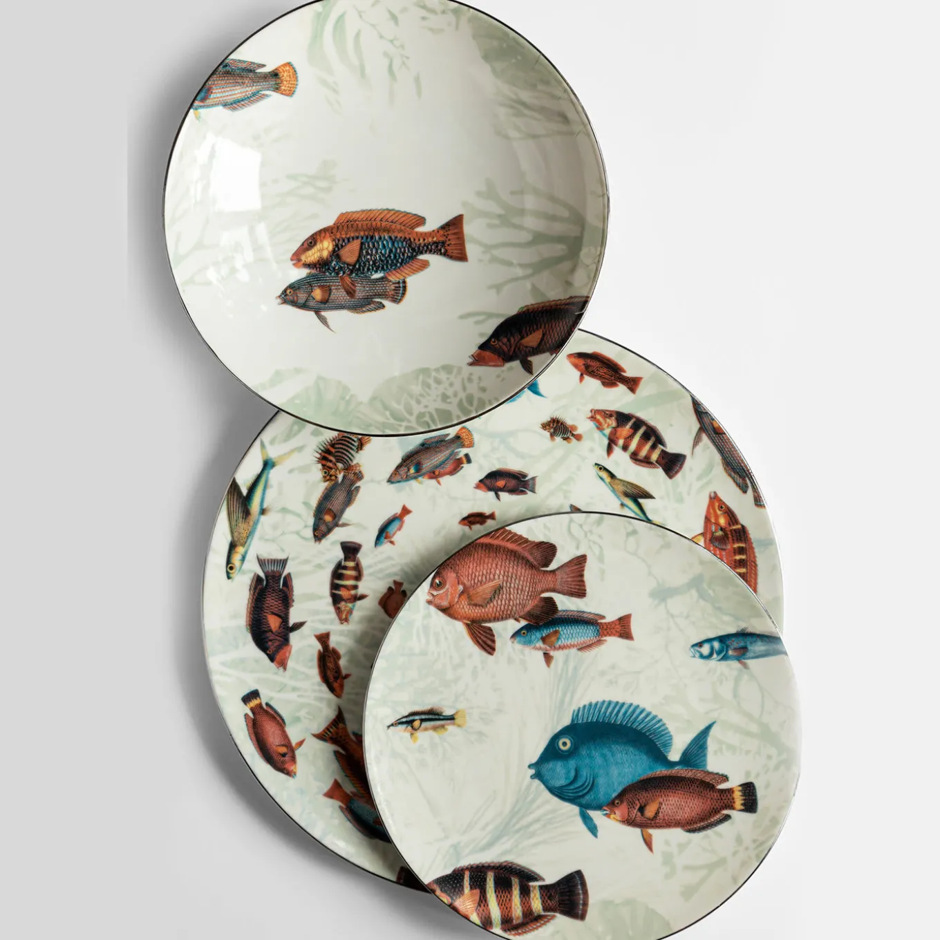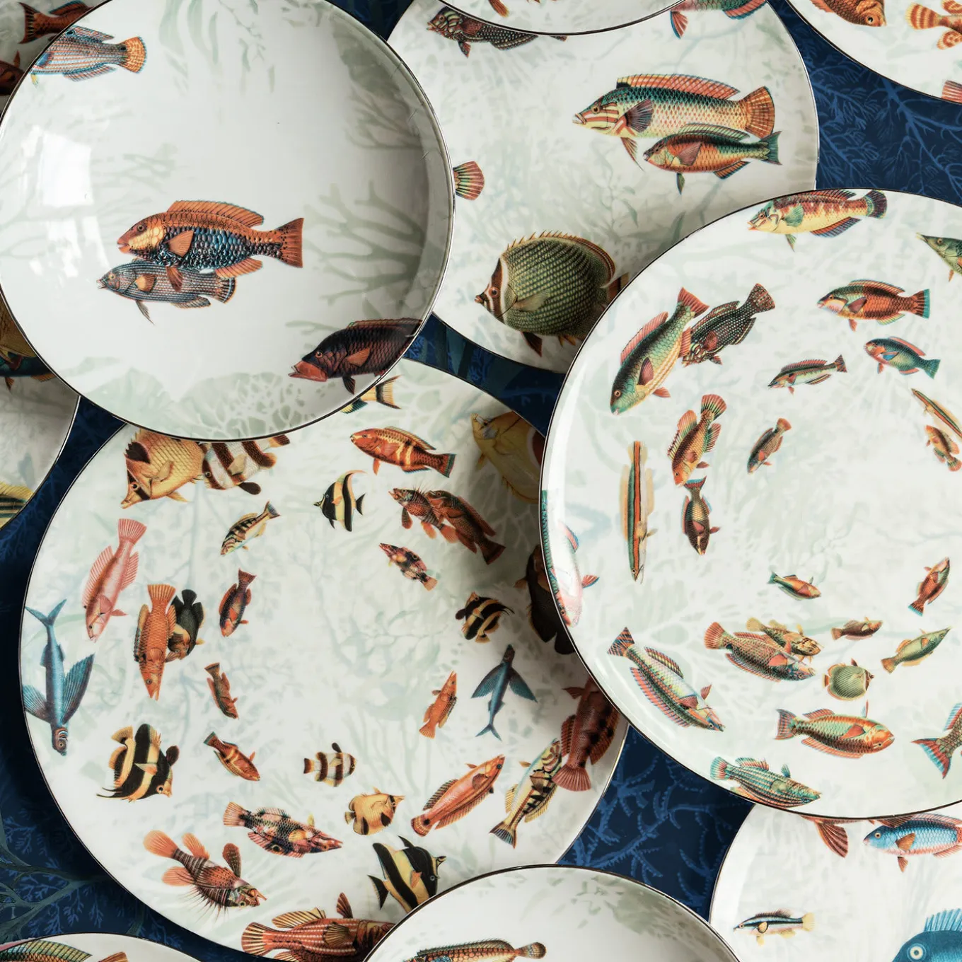 Part of an exquisite series inspired by the unique colors of the marine species inhabiting the Japanese Amami Islands’ seascape, this soup plate will make a refined addition to both a contemporary or classic dining table. This objet d’art is handcrafted of porcelain and features a dynamic portrait of a school of fish entirely painted by hand.