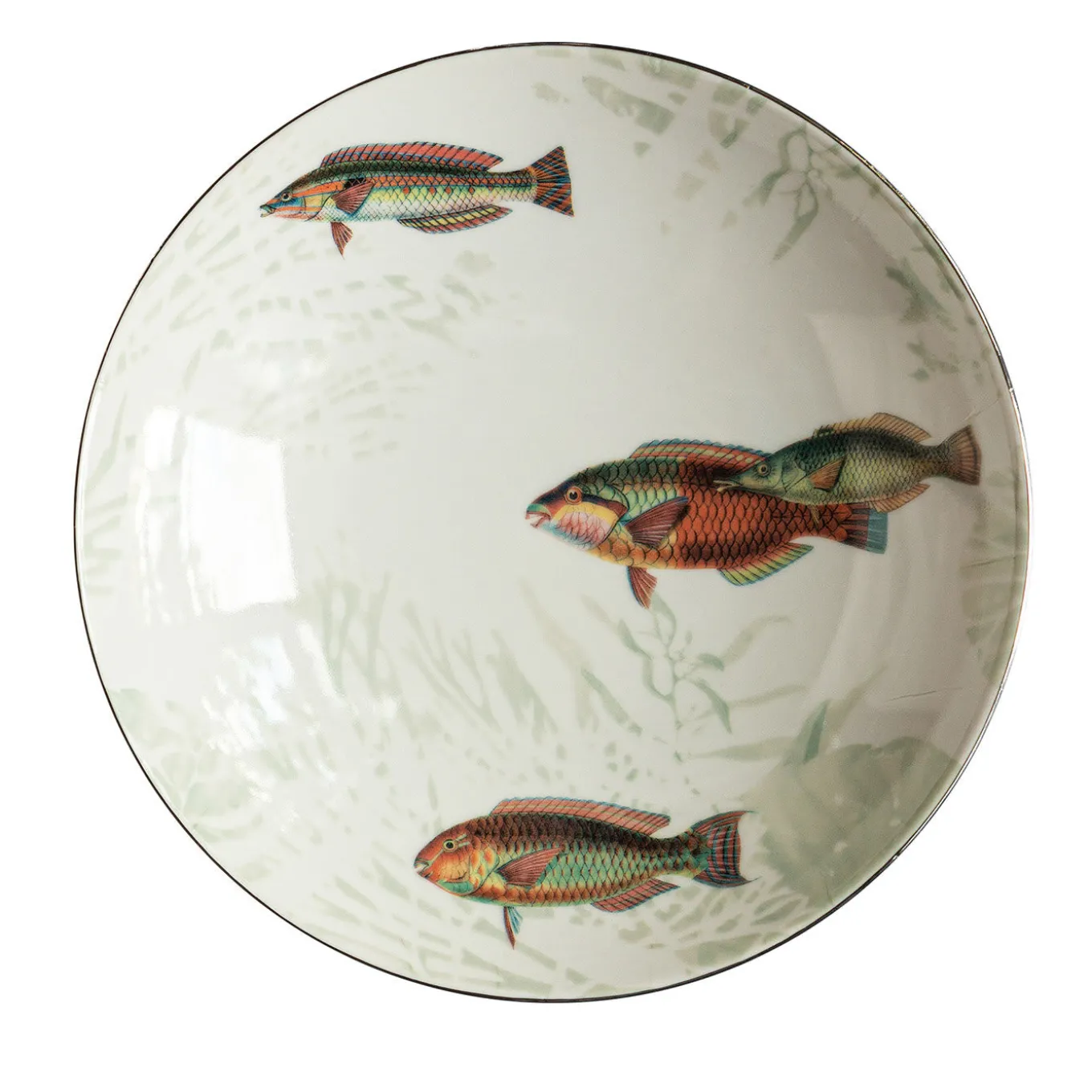 Distinguished by a mesmerizing combination of emerald green and red hues, the hand-painted fish motifs delicately enhance this porcelain soup plate. A singular piece from the Amami Islands series designed by artist Vito Nesta, this piece is best paired with others from the same series for a stunning visual effect.