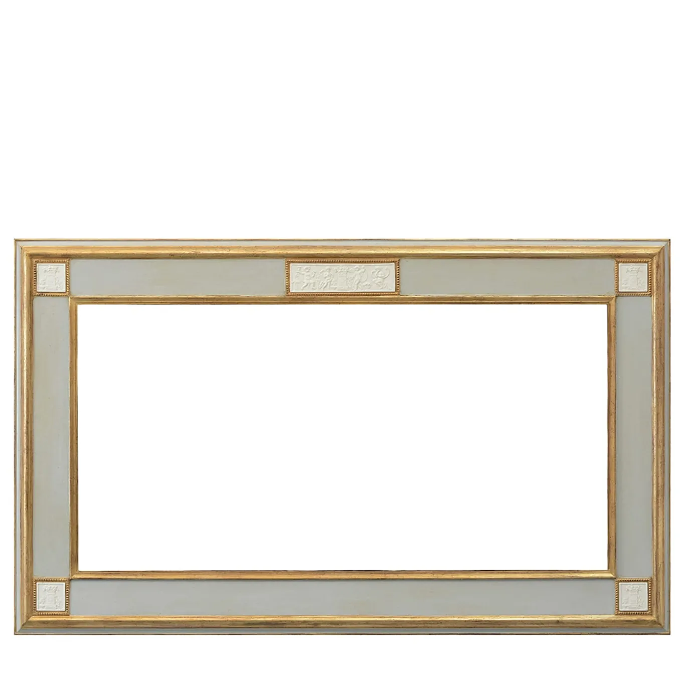 Elegant frame in lacquered and golden wood with gold sheets and applications of biscuit plates with allegoric scenes. Please, contact the Concierge service for further information.