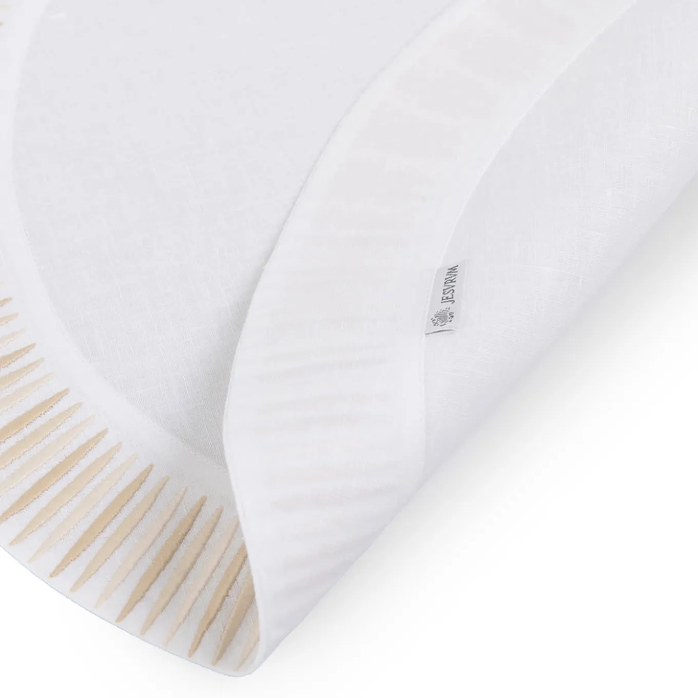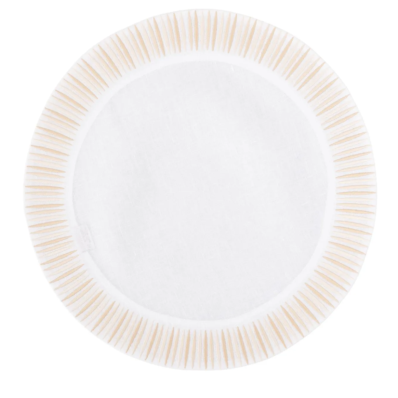 A luminous and lively design to decorate an elegantly-set dining table on a special occasion, this round placemat is characterized by sunrays-like embroideries handmade using three different shades of beige. Handcrafted of precious white linen, it is a sophisticated display of traditional craftsmanship.
