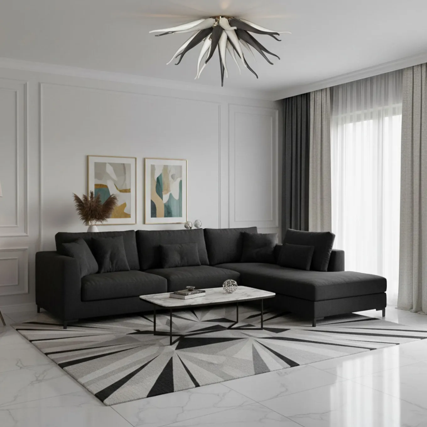 The Anenome di Luce ceiling lamp captures the organic elegance of a marine anemone through its sculptural design. Featuring elongated, curved glass arms in a monochrome palette, it offers dynamic movement and visual depth. With a polished chrome finish and generous dimensions (H 40 cm x D 80 cm), this medium-sized fixture serves as both an ambient light source and a striking decorative piece. Custom sizes and colors are available to suit varied interior settings.