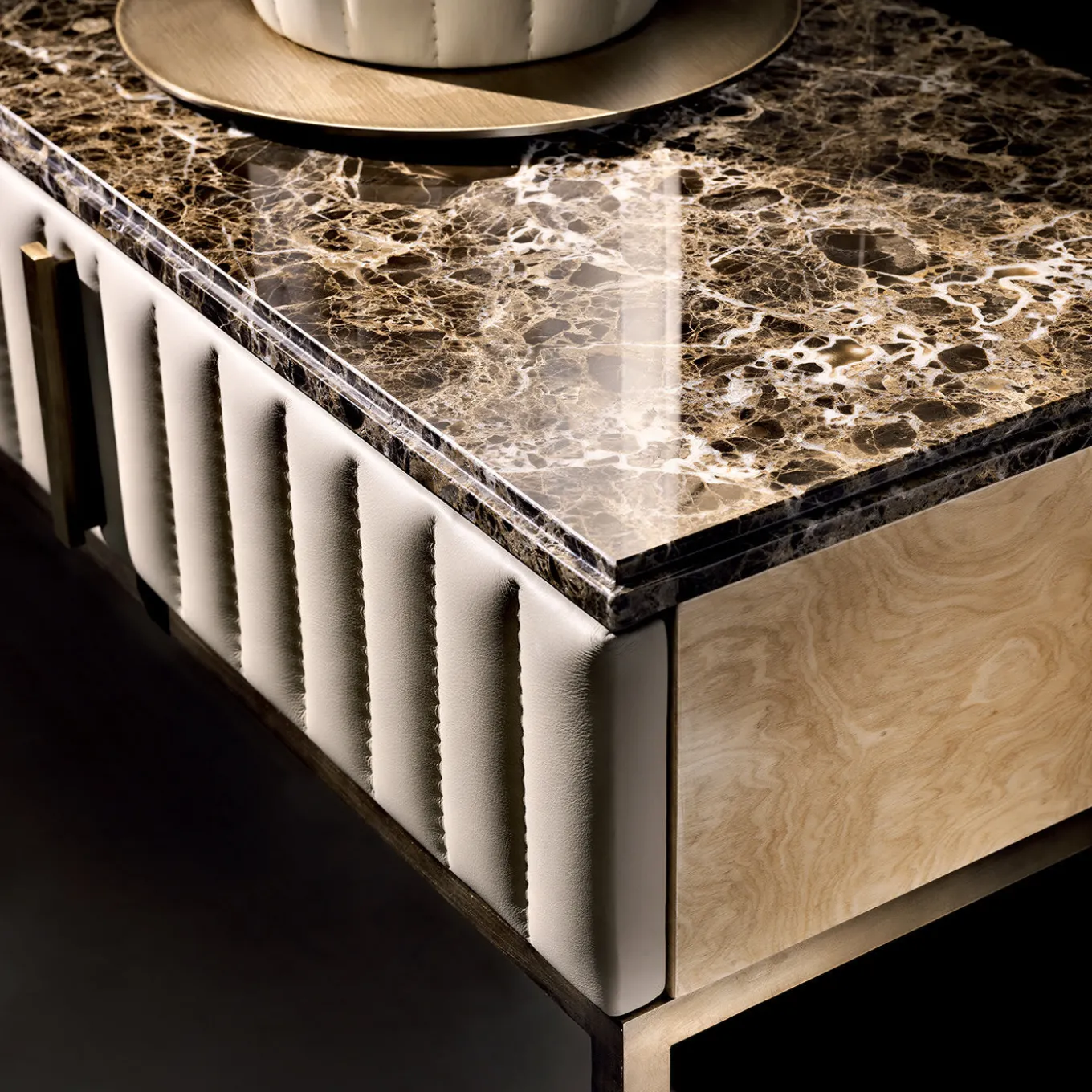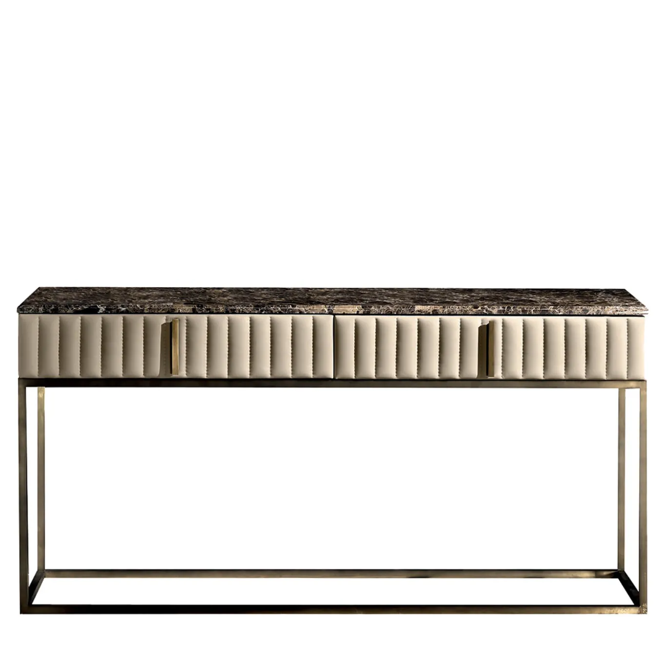 Placed in the living room or in an entryway as a supporting surface for lamps, vases, candle holders, or books, this console is a sure eye-catcher. Made of wood with a myrtle burl veneer and brushed gloss finish, it features two large drawers with grosgrain leather front covers (in the picture: Clayton lumiere 1639) and burnished brass rectangular handles. The square tubular base is in burnished brass and the top in Emperador marble.