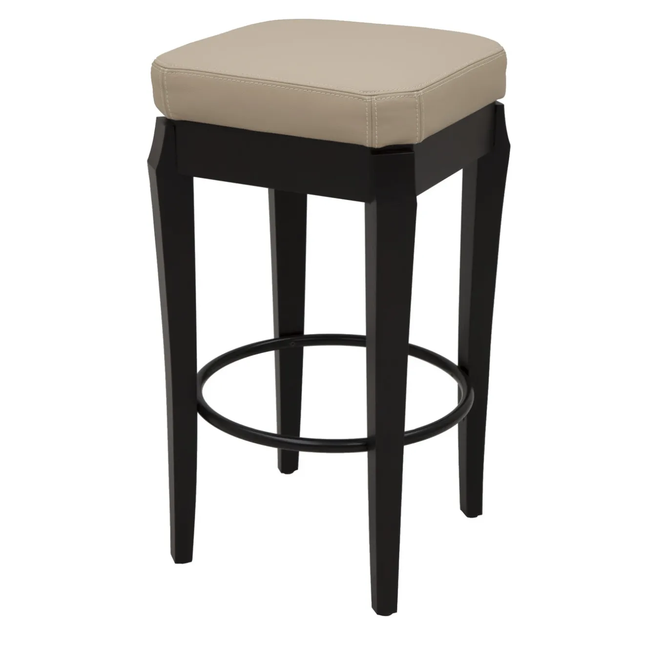 This bar stool offers a stylish way to add a dash of elegance and charm to any style decor. Its visual appeal lies in the simple structural design that is complemented by the timeless combination of color and material used. The square seat is fitted with a cushion upholstered in off-white leather with double decorative stitching in matching color to provide seating comfort with style. Featuring a black matte finish and a round foot rest inside the square wooden frame with long, tapered legs, this stunning stool is the perfect fit for a kitchen island, breakfast counter, or game room.