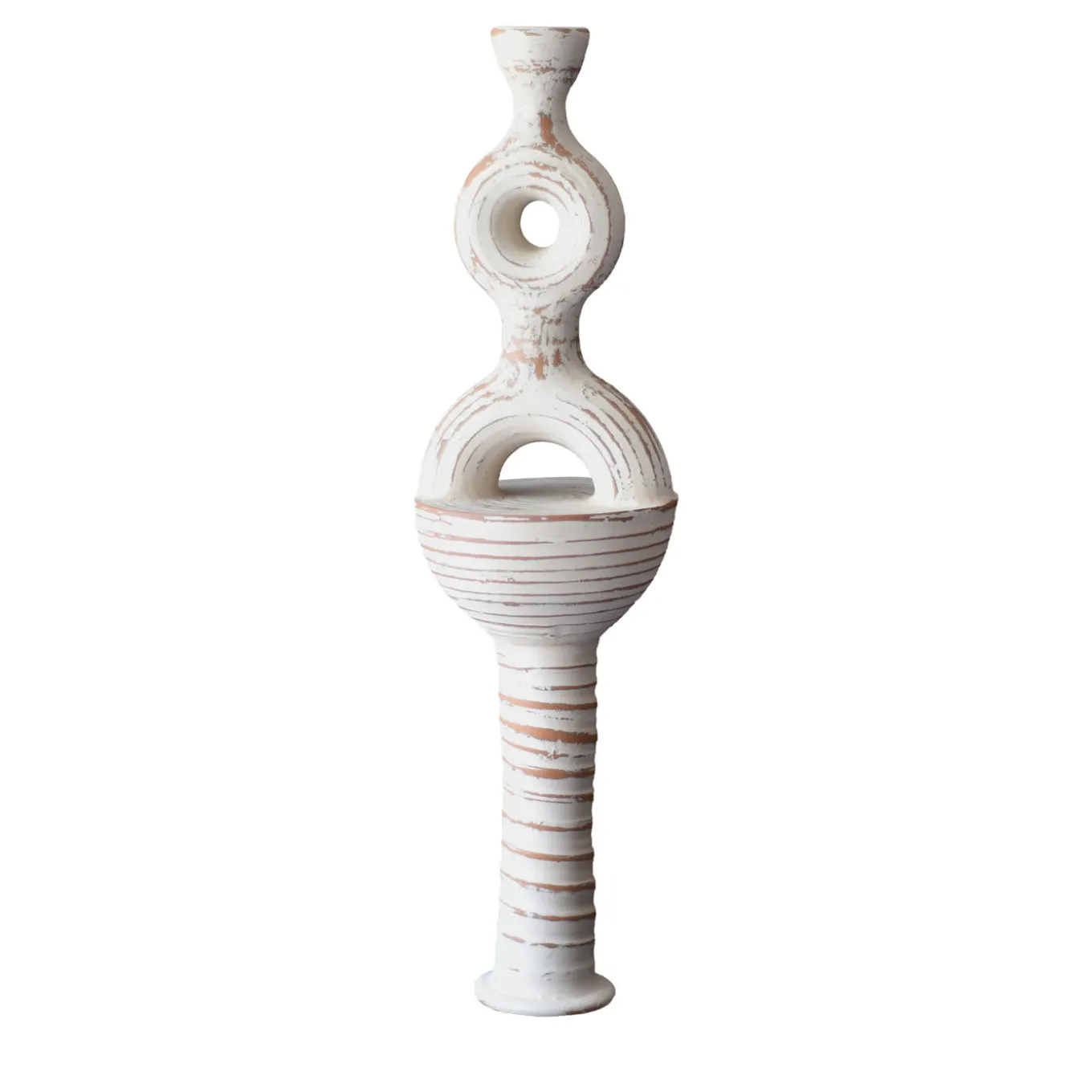 This eye-catching amphora in terracotta will accent any interior with its modern aesthetic recalling elegant anthropomorphic proportions. Its slender body, graced by two crossing circular elements, is shaped and molded entirely by hand using the lathe and consequently applying the “ingobbio” technique where multiple layers of liquid clay overlap onto the base before being fired to create an appealing texture.