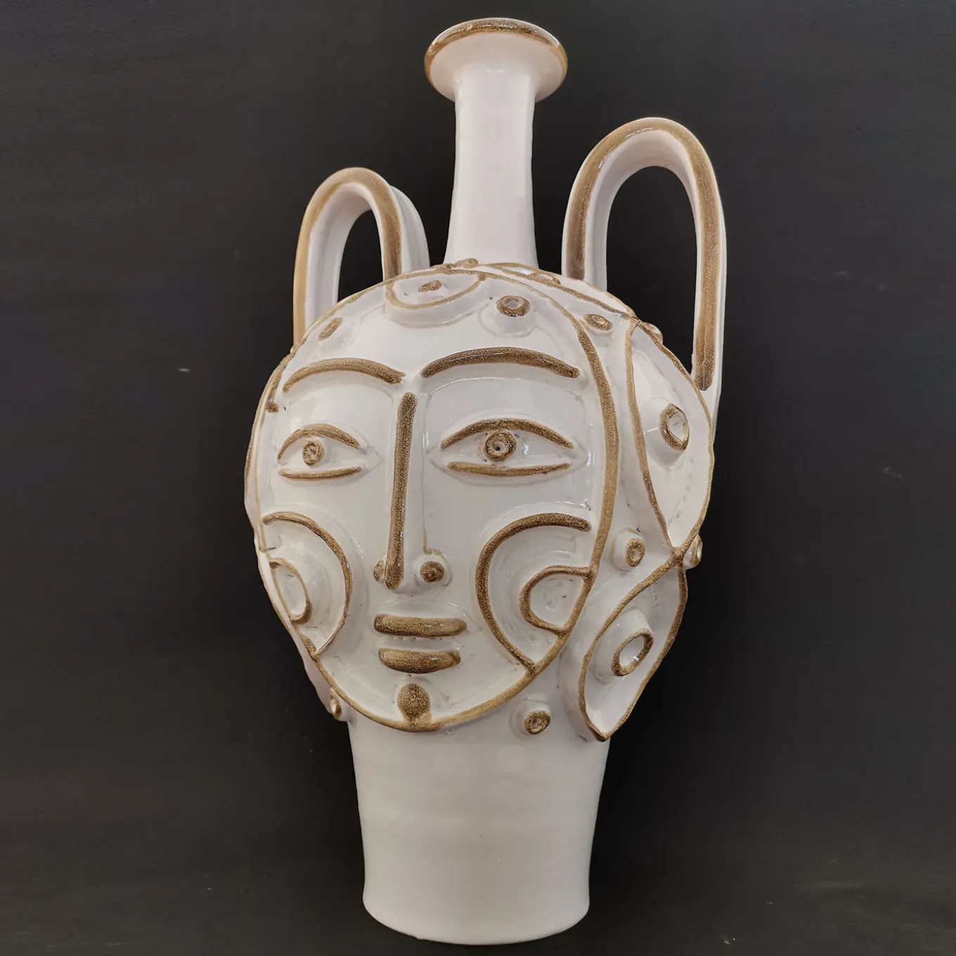 An unrepeatable piece patiently turned, molded, and decorated by hand, this amphora vase seduces with its anthropomorphic features traced with neat lines. High-relief ornaments maximize the piece’s decorative impact, which results counterbalanced by a quiet white glaze with details traced in an elegant soft-brown hue. Dramatically curved handles and a long narrow neck seal the design.