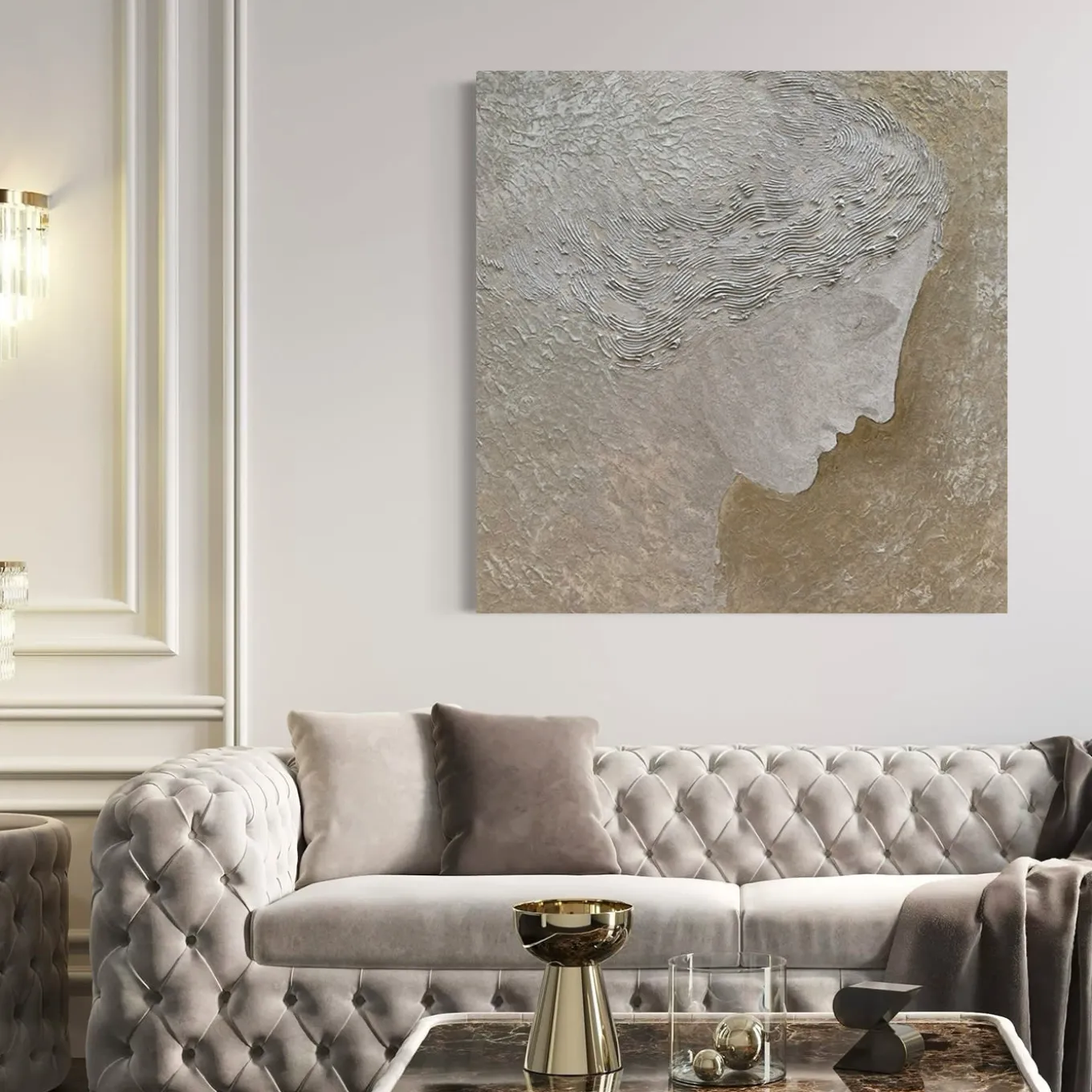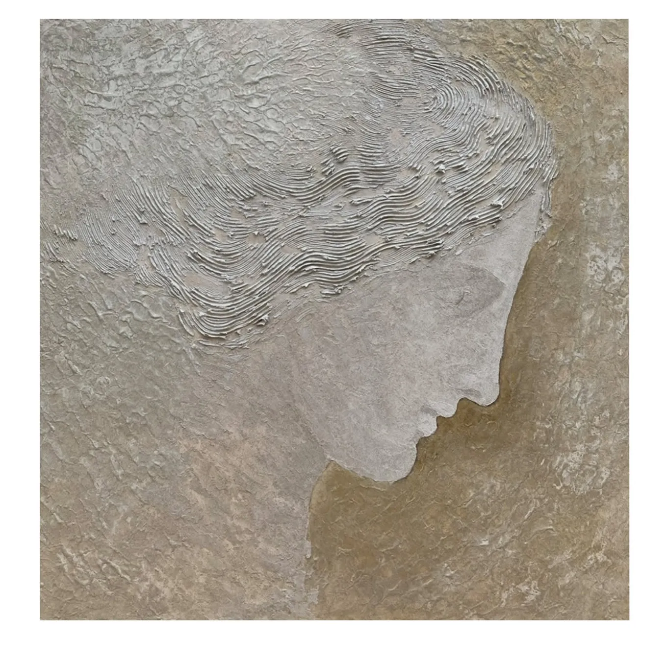 Inspired by the iconic grace of Greek statuary, this wall-mounted sculpture captures a timeless moment in motion. Crafted in resin, the textured figure stands out against a gold background, enriched with tactile pigments and intricate spatula work. The dimensional effect transforms it into a “wall sculpture,” achieved through a sophisticated blend of sands, resins, and adhesives. This artwork is a tribute to an enduring aesthetic, balancing historical homage with contemporary technique. Each painting is unique.