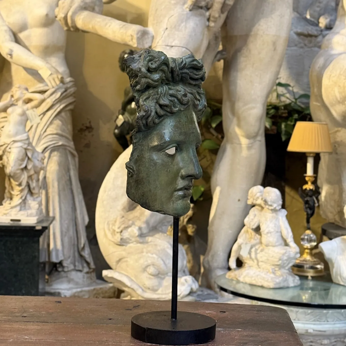 A superb addition to a personal collection or a magnificent gift for a lover of antiquity, this mask reproduces in stunning detail the iconography of the Greek god Apollo, as seen in the post-Hellenist marble statue displayed at the Cortile Belvedere in the Vatican Museums, in Rome. The irregular cut of the piece gives it the allure of a fragment found among ruins, which contrasts with the serene elegance of the portrait. The bronze mask rests on an iron pedestal and will make a splendid addition to any decor.