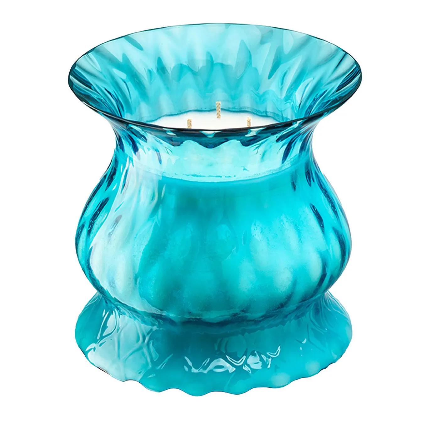 The intense cerulean blue Murano glass creates a magnetic vase with accentuated relief of macramé techniques. A Venetian signature style that everyone loves. The artistic glass is embellished with a particular texture that gives the surface a faceted and three-dimensional effect. The fragrance has multiple layers: notes of incense and saffron, the heart with sweet strawberry, and the base with sandalwood, white leather, and patchouli.