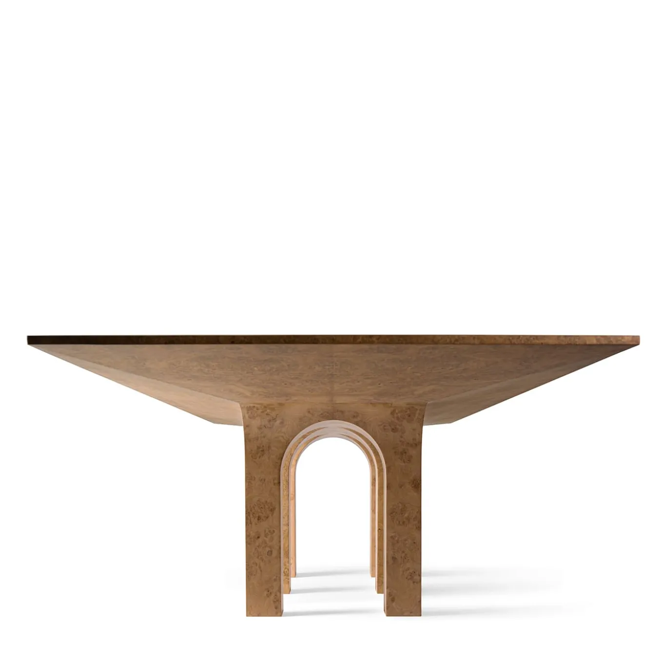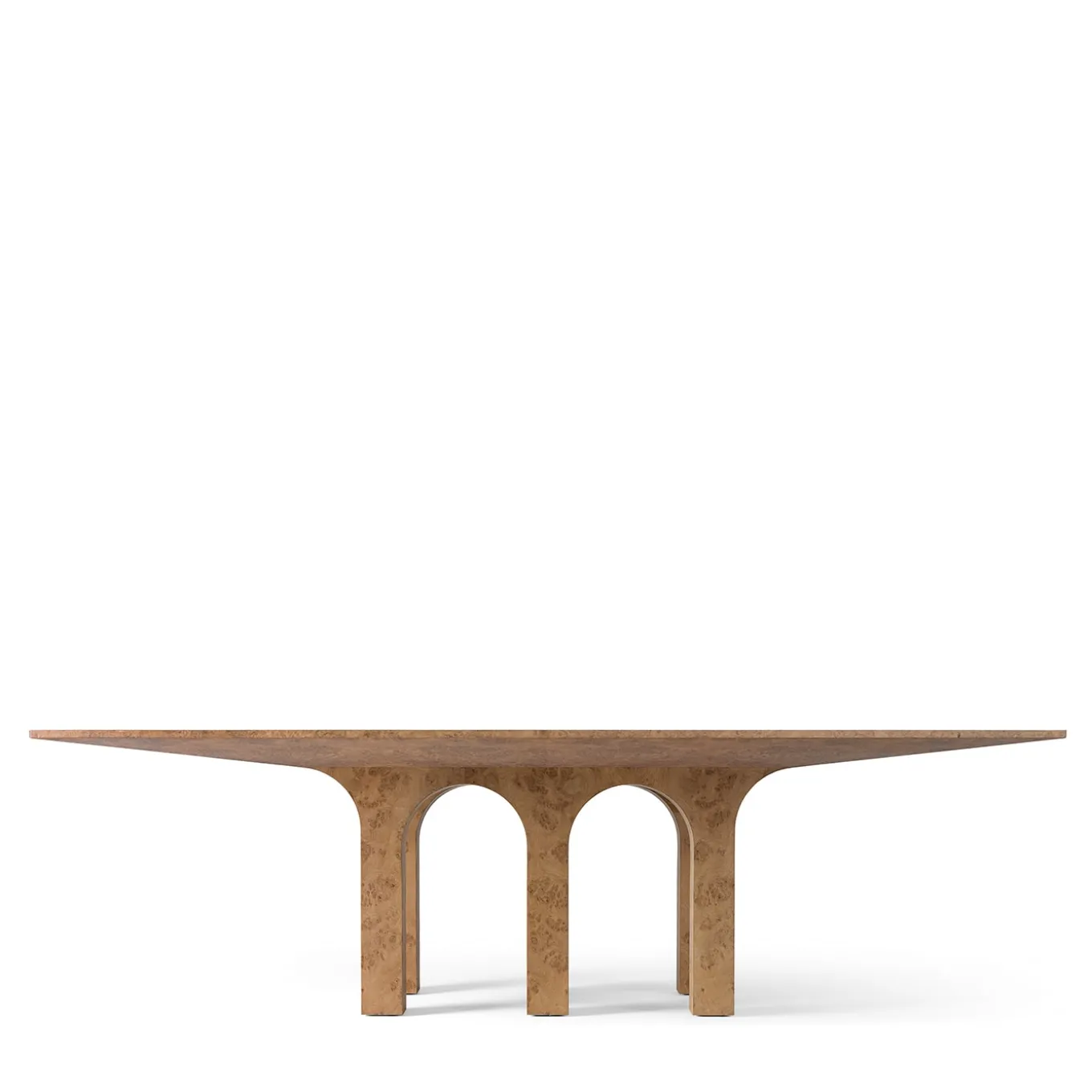 Introducing Archi, a dining table crafted from oak burl and solid oak, supported by six gracefully arched legs. The top is enriched with black ebony inlays which add a touch of sophistication with their intricate geometric designs. Designed by Storage Milano, this piece is finished in natural matte, offering a sleek surface with 0% gloss.